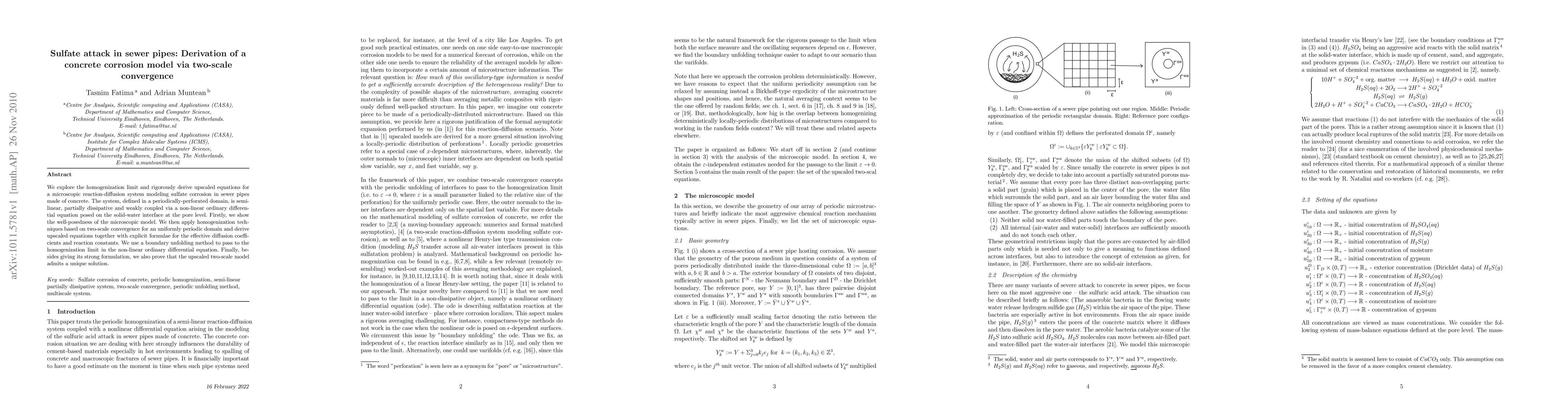 This paper derives upscaled equations for a reaction-diffusion model of sulfate corrosion in concrete sewer pipes using two-scale convergence. It rigorously proves the well-posedness of the microscopic model and demonstrates the derivation of effective diffusion coefficients and reaction constants through homogenization techniques.
