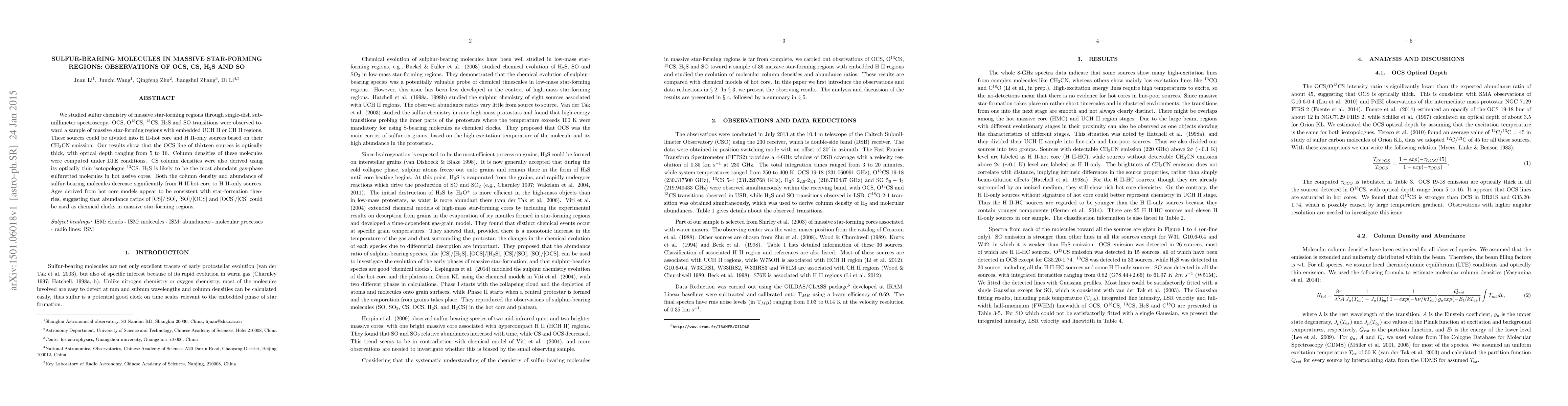 This study investigates sulfur chemistry in massive star-forming regions using submillimeter spectroscopy, finding that OCS is optically thick and H2S is abundant in hot cores. The abundance of sulfur-bearing molecules decreases from H II-hot core to H II-only sources, suggesting these ratios can serve as chemical clocks in star-formation processes.