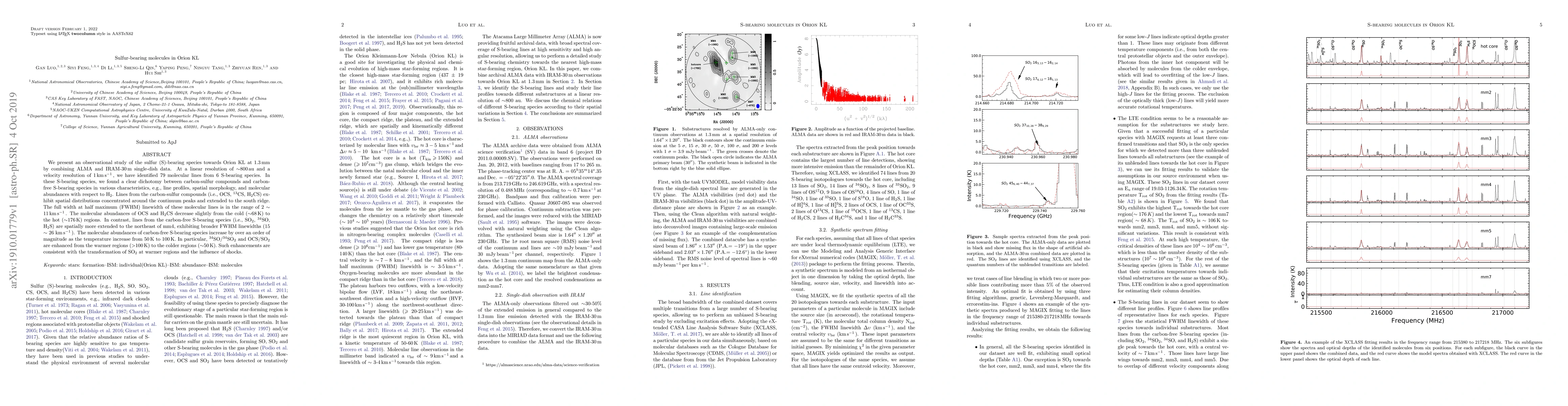 We present an observational study of the sulfur (S)-bearing species towards Orion KL at 1.3 mm by combining ALMA and IRAM-30\,m single-dish data. At a linear resolution of $\sim$800 au and a velocity resolution of 1 $\mathrm{km\, s^{-1}\, }$, we have identified 79 molecular lines from 6 S-bearing species. In these S-bearing species, we found a clear dichotomy between carbon-sulfur compounds and carbon-free S-bearing species in various characteristics, e.g., line profiles, spatial morphology, and molecular abundances with respect to $\rm H_2$. Lines from the carbon-sulfur compounds (i.e., OCS, $^{13}$CS, H$_2$CS) exhibit spatial distributions concentrated around the continuum peaks and extended to the south ridge. The full width at half maximum (FWHM) linewidth of these molecular lines is in the range of 2 $\sim$ 11 $\mathrm{km\, s^{-1}\, }$. The molecular abundances of OCS and H$_2$CS decrease slightly from the cold ($\sim$68 K) to the hot ($\sim$176 K) regions. In contrast, lines from the carbon-free S-bearing species (i.e., SO$_2$, $^{34}$SO, H$_2$S) are spatially more extended to the northeast of mm4, exhibiting broader FWHM linewidths (15 $\sim$ 26 $\mathrm{km\, s^{-1}\, }$). The molecular abundances of carbon-free S-bearing species increase by over an order of magnitude as the temperature increase from 50 K to 100 K. In particular, $\mathrm{^{34}SO/^{34}SO_2}$ and $\mathrm{OCS/SO_2}$ are enhanced from the warmer regions ($>$100 K) to the colder regions ($\sim$50 K). Such enhancements are consistent with the transformation of SO$_2$ at warmer regions and the influence of shocks.