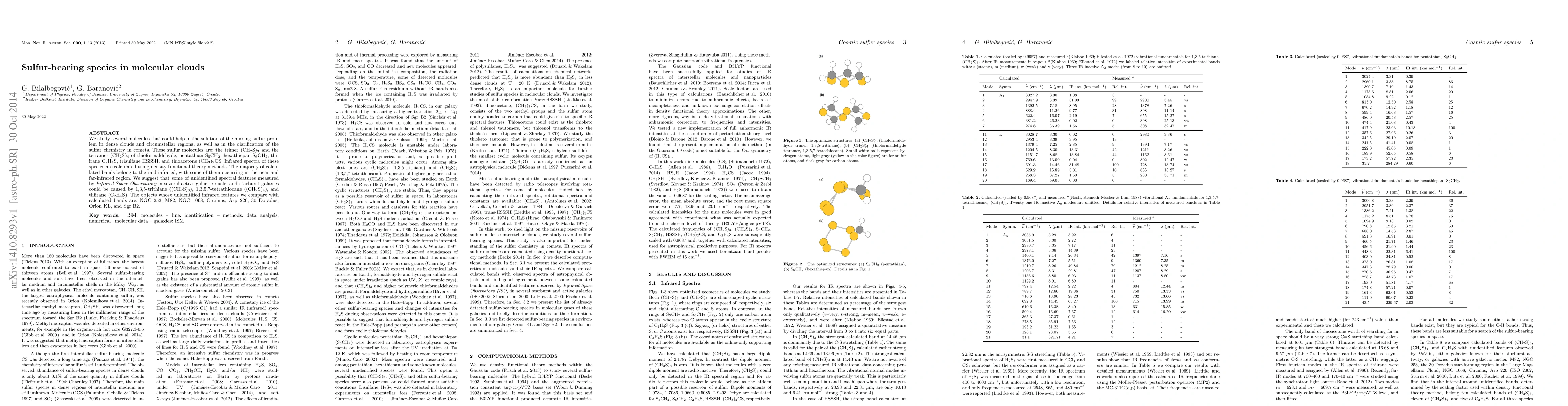 We study several molecules that could help in the solution of the missing sulfur problem in dense clouds and circumstellar regions, as well as in the clarification of the sulfur chemistry in comets. These sulfur molecules are: the trimer (CH2S)3 and the tetramer (CH2S)4 of thioformaldehyde, pentathian S5CH2, hexathiepan S6CH2, thiirane C2H4S, trisulfane HSSSH, and thioacetone (CH3)2CS. Infrared spectra of these species are calculated using density functional theory methods. The majority of calculated bands belong to the mid-infrared, with some of them occurring in the near and far-infrared region. We suggest that some of unidentified spectral features measured by Infrared Space Observatory in several active galactic nuclei and starburst galaxies could be caused by 1,3,5-trithiane ((CH2S)3), 1,3,5,7-tetrathiocane ((CH2S)4), and thiirane (C2H4S). The objects whose unidentified infrared features we compare with calculated bands are: NGC 253, M82, NGC 1068, Circinus, Arp 220, 30 Doradus, Orion KL, and Sgr B2.
