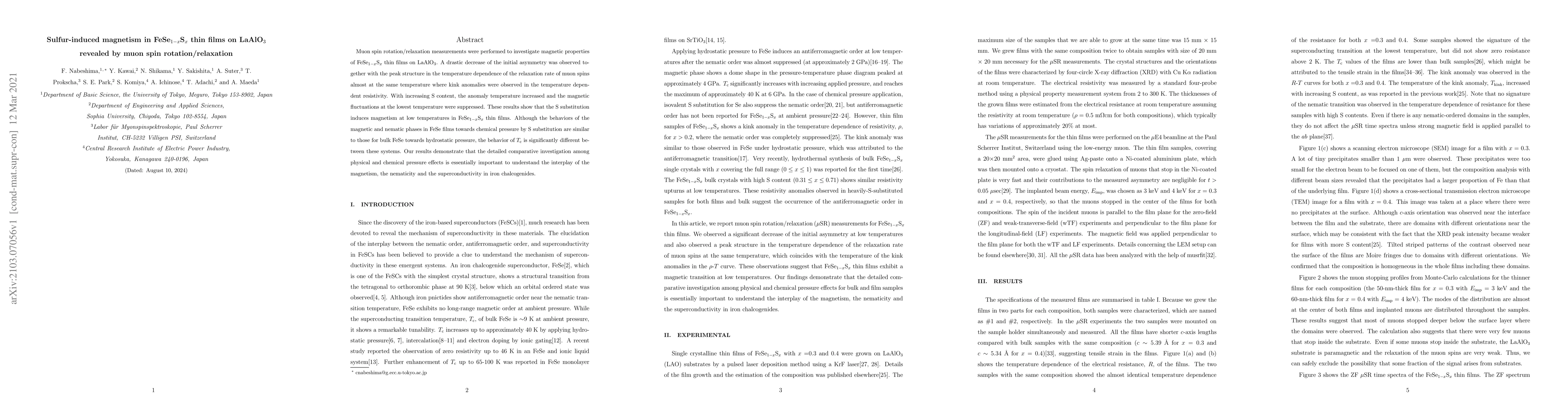 Muon spin rotation/relaxation measurements reveal that sulfur substitution in FeSe$_{1-x}$S$_x$ thin films induces magnetism at low temperatures, correlating with resistivity anomalies. Comparative studies highlight the distinct behavior of $T_{\mathrm c}$ under chemical versus physical pressure, underscoring the importance of understanding these interactions in iron chalcogenides.