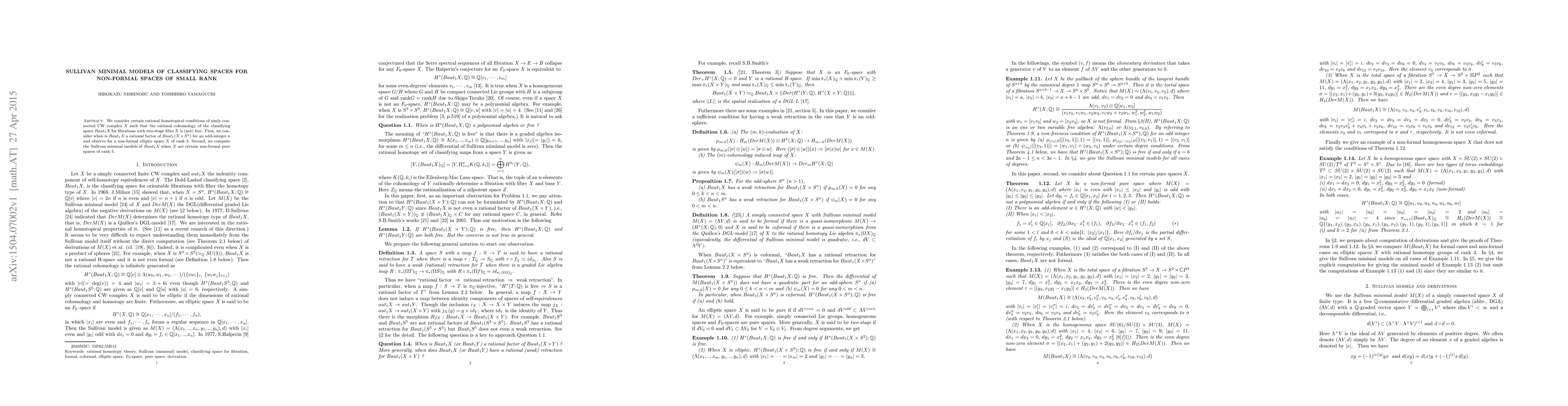 This paper investigates rational homotopical conditions for simply connected CW complexes $X$ where the classifying space $Baut_1X$ for fibrations with two-stage fiber $X$ has non-free rational cohomology. It examines when $Baut_1X$ is a rational factor of $Baut_1(X\times S^n)$ for odd $n$, specifically for a non-formal elliptic space of rank 3, and computes the Sullivan minimal models for certain non-formal pure spaces of rank 5.