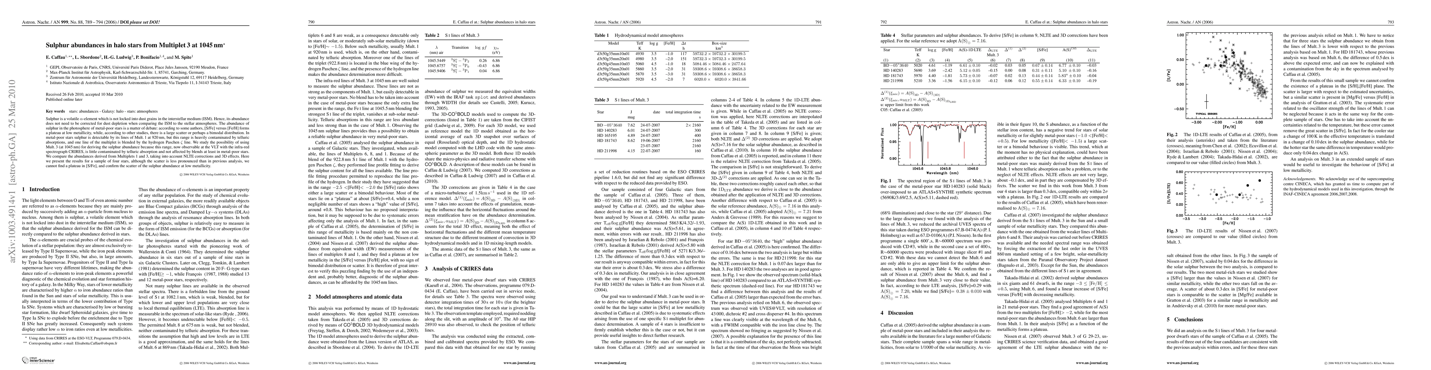 This paper investigates sulphur abundances in metal-poor halo stars using the Multiplet 3 lines at 1045 nm, which are less contaminated by telluric absorption compared to the Multiplet 1 lines at 920 nm. The study finds a scatter in sulphur abundances at low metallicity, without confirming a plateau, thus supporting previous debates on sulphur's distribution in stellar atmospheres.