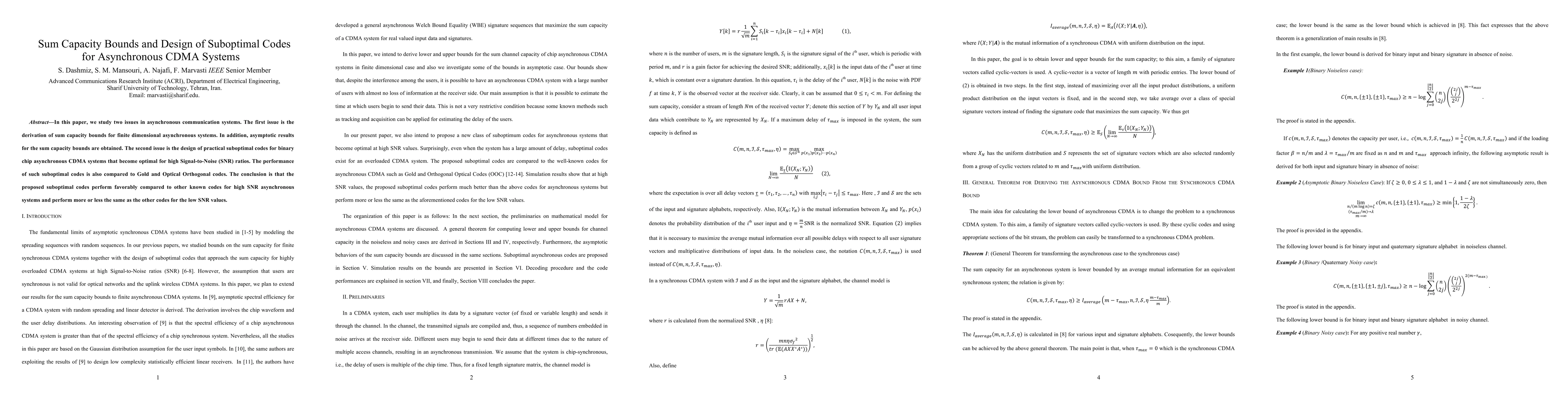 This paper derives sum capacity bounds for finite and asymptotic asynchronous communication systems and designs practical suboptimal codes for high Signal-to-Noise Ratios in binary chip asynchronous CDMA systems, showing they outperform Gold and Optical Orthogonal codes at high SNRs.