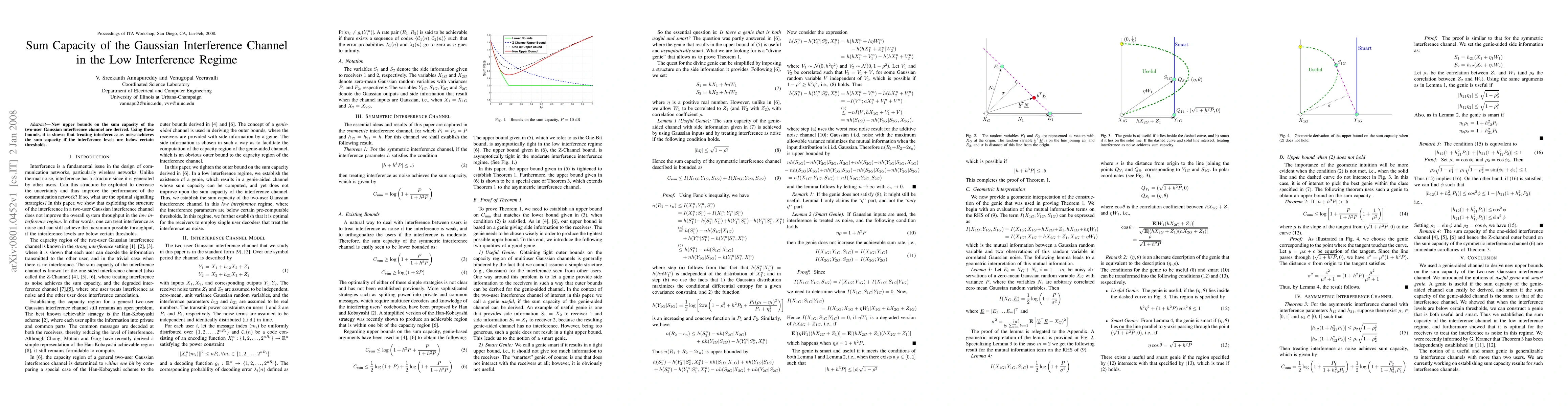 Summary: This paper derives new upper bounds for the sum capacity of the two-user Gaussian interference channel, demonstrating that treating interference as noise can achieve the sum capacity when interference levels are sufficiently low.