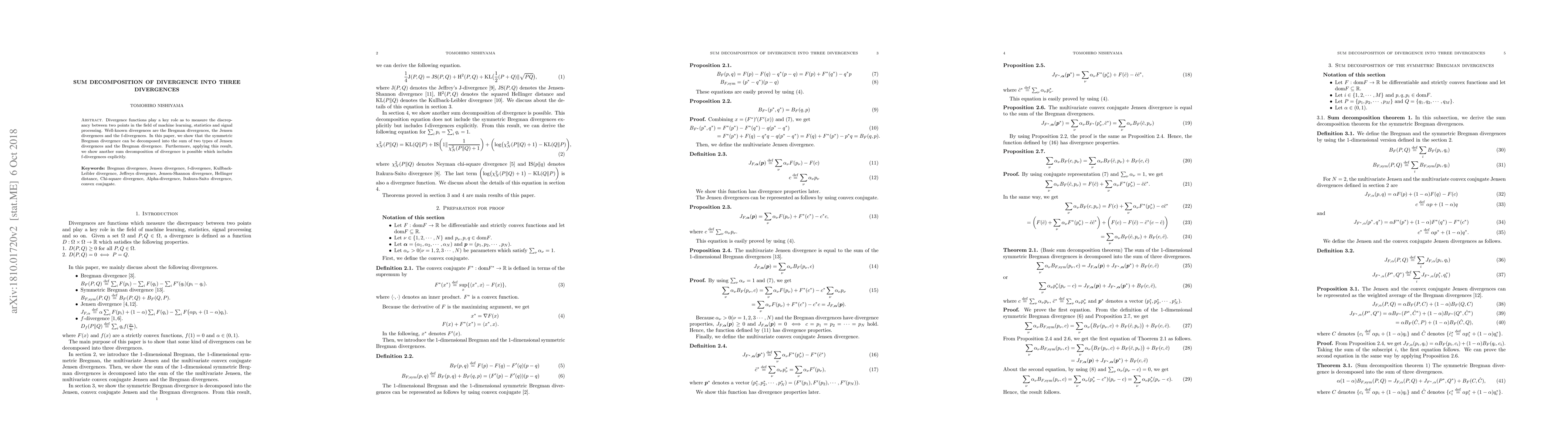 Divergence functions play a key role as to measure the discrepancy between two points in the field of machine learning, statistics and signal processing. Well-known divergences are the Bregman divergences, the Jensen divergences and the f-divergences. In this paper, we show that the symmetric Bregman divergence can be decomposed into the sum of two types of Jensen divergences and the Bregman divergence. Furthermore, applying this result, we show another sum decomposition of divergence is possible which includes f-divergences explicitly.