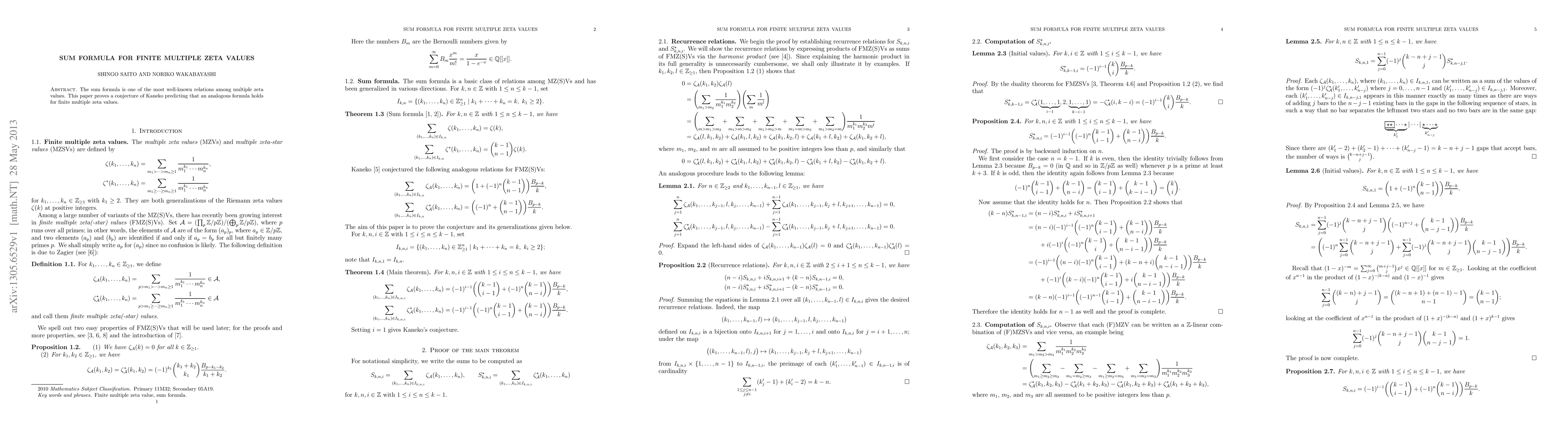 This paper proves Kaneko's conjecture establishing a sum formula for finite multiple zeta values, analogous to the well-known sum formula for regular multiple zeta values. The result extends the understanding of these special number sequences.