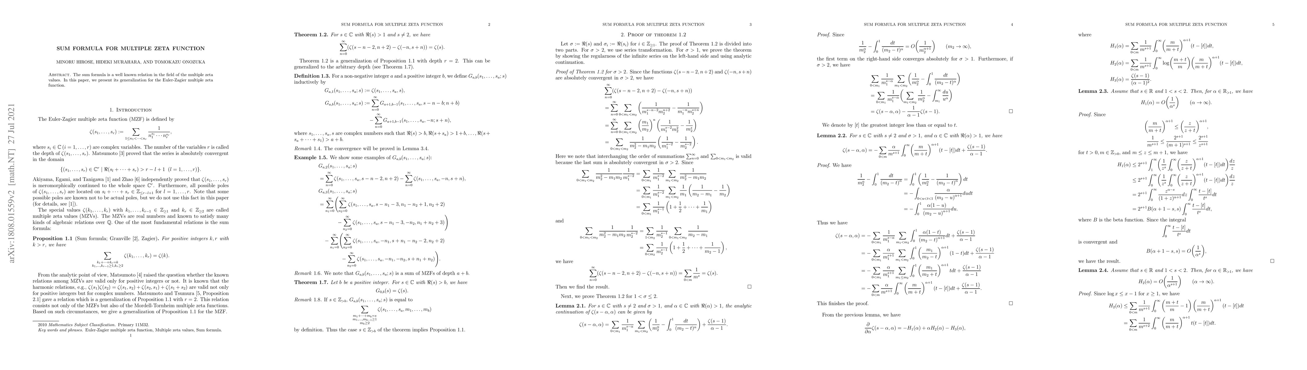 The sum formula is a well known relation in the field of the multiple zeta values. In this paper, we present its generalization for the Euler-Zagier multiple zeta function.