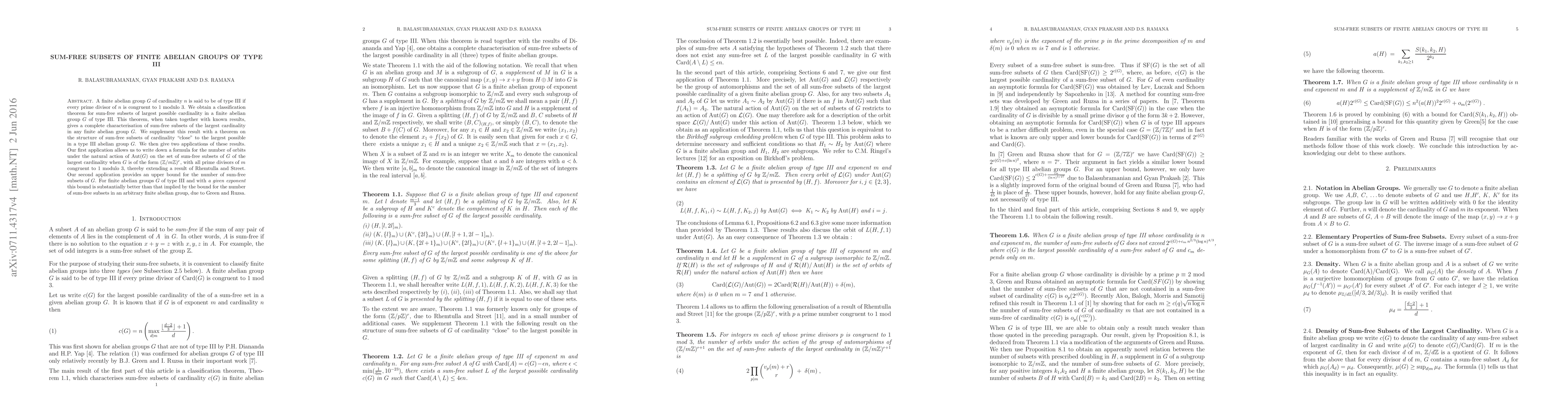 A finite abelian group $G$ of cardinality $n$ is said to be of type III if every prime divisor of $n$ is congruent to 1 modulo 3. We obtain a classification theorem for sum-free subsets of largest possible cardinality in a finite abelian group $G$ of type III. This theorem, when taken together with known results, gives a complete characterisation of sum-free subsets of the largest cardinality in any finite abelian group $G$. We supplement this result with a theorem on the structure of sum-free subsets of cardinality "close" to the largest possible in a type III abelian group $G$. We then give two applications of these results. Our first application allows us to write down a formula for the number of orbits under the natural action of ${\rm Aut}(G)$ on the set of sum-free subsets of $G$ of the largest cardinality when $G$ is of the form $({\mathbf{Z}}/m{\mathbf{Z}})^r$, with all prime divisors of $m$ congruent to 1 modulo 3, thereby extending a result of Rhemtulla and Street. Our second application provides an upper bound for the number of sum-free subsets of $G$. For finite abelian groups $G$ of type III and with {\em a given exponent} this bound is substantially better than that implied by the bound for the number of sum-free subsets in an arbitrary finite abelian group, due to Green and Ruzsa.
