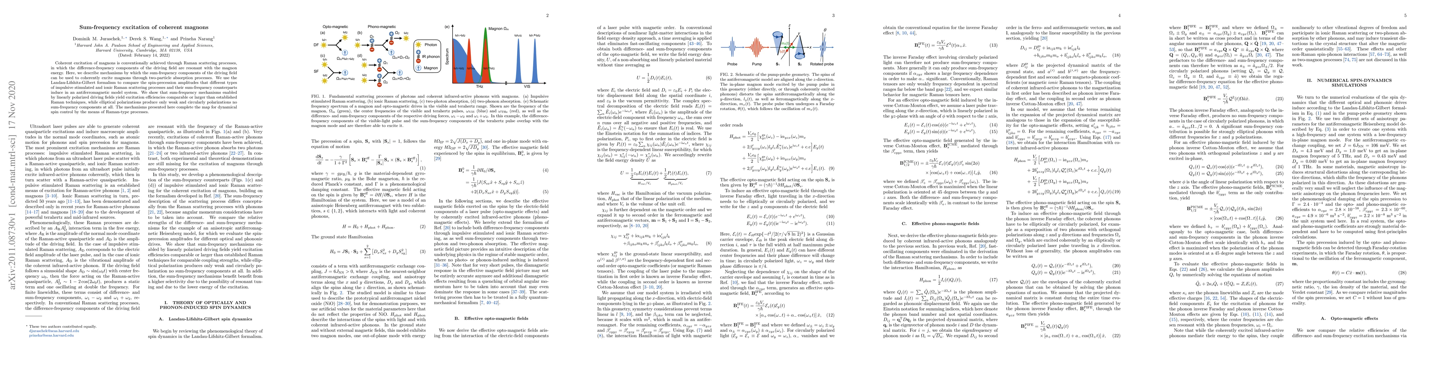 Coherent excitation of magnons is conventionally achieved through Raman scattering processes, in which the difference-frequency components of the driving field are resonant with the magnon energy. Here, we describe mechanisms by which the sum-frequency components of the driving field can be used to coherently excite magnons through two-particle absorption processes. We use the Landau-Lifshitz-Gilbert formalism to compare the spin-precession amplitudes that different types of impulsive stimulated and ionic Raman scattering processes and their sum-frequency counterparts induce in an antiferromagnetic model system. We show that sum-frequency mechanisms enabled by linearly polarized driving fields yield excitation efficiencies comparable or larger than established Raman techniques, while elliptical polarizations produce only weak and circularly polarizations no sum-frequency components at all. The mechanisms presented here complete the map for dynamical spin control by the means of Raman-type processes.