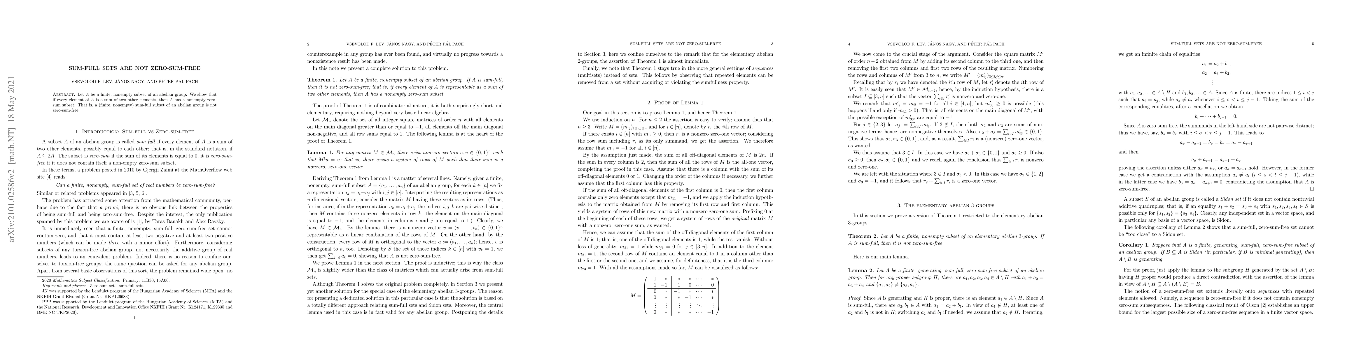 The paper presents a combinatorial proof that sum-full subsets of abelian groups cannot be zero-sum-free, introducing Lemma 1 as a key technical tool.