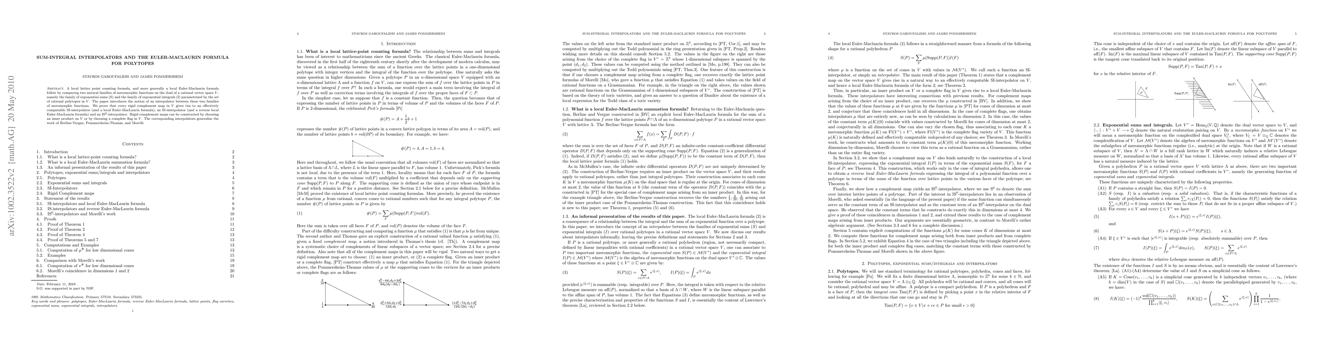 A local lattice point counting formula, and more generally a local Euler-Maclaurin formula follow by comparing two natural families of meromorphic functions on the dual of a rational vector space $V$, namely the family of exponential sums (S) and the family of exponential integrals (I) parametrized by the set of rational polytopes in $V$. The paper introduces the notion of an interpolator between these two families of meromorphic functions. We prove that every rigid complement map in $V$ gives rise to an effectively computable \SI-interpolator (and a local Euler-MacLaurin formula), an \IS-interpolator (and a reverse local Euler-MacLaurin formula) and an \ISo-interpolator. Rigid complement maps can be constructed by choosing an inner product on $V$ or by choosing a complete flag in $V$. The corresponding interpolators generalize and unify the work of Berline-Vergne, Pommersheim-Thomas, and Morelli.