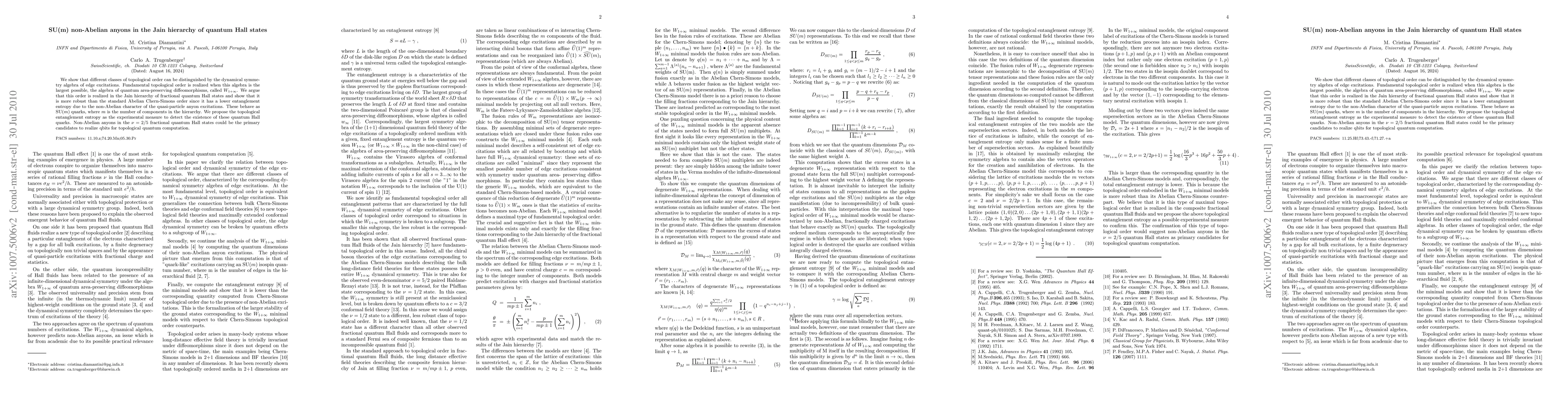This paper distinguishes topological orders by edge excitations' dynamical symmetry algebra, showing that the largest algebra, $W_{1+\infty}$, indicates fundamental topological order realized in Jain hierarchy quantum Hall states. It argues this non-Abelian order is more robust than Abelian Chern-Simons order due to lower entanglement entropy and proposes topological entanglement entropy as a measure to detect non-Abelian anyons in $\nu = 2/5$ states, which may serve as qubits for topological quantum computation.