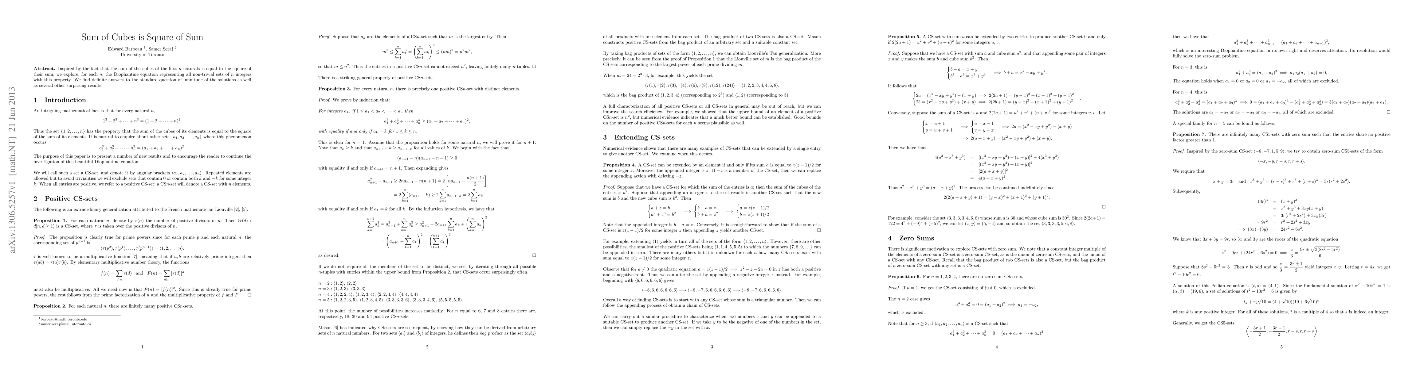 This paper investigates Diophantine equations for sets of $n$ integers whose cubes sum to the square of their sum. It confirms the infinitude of such solutions and uncovers additional unexpected findings.