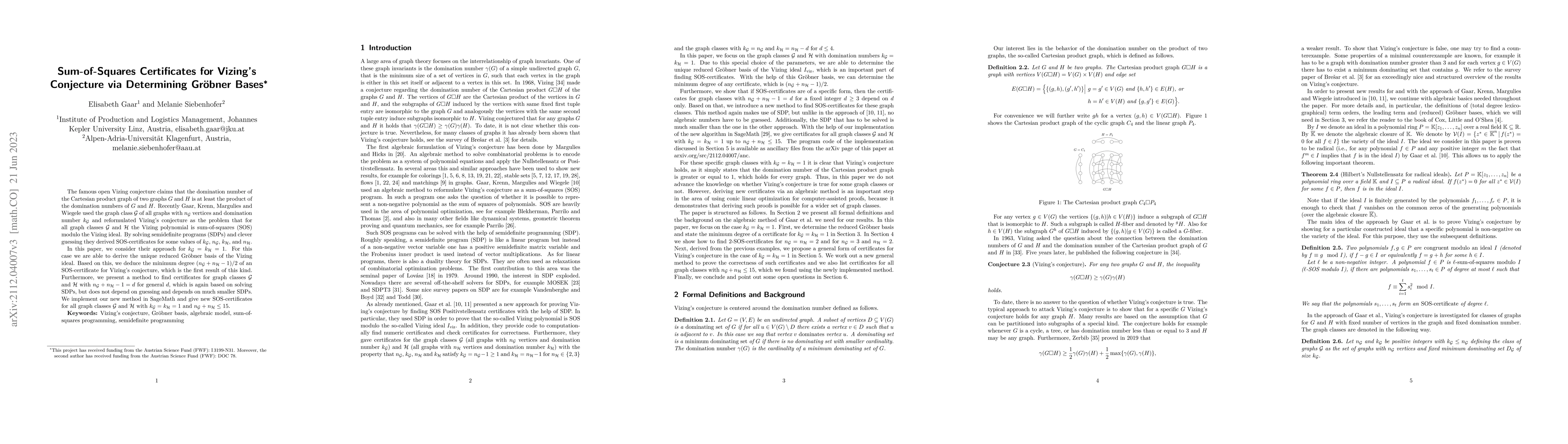 This paper reformulates Vizing's conjecture using sum-of-squares (SOS) certificates and Gröbner bases, deriving the minimum degree for SOS-certificates when the domination number is 1. It also presents a new method for finding certificates without guessing, implemented in SageMath, and provides new certificates for small graph classes.
