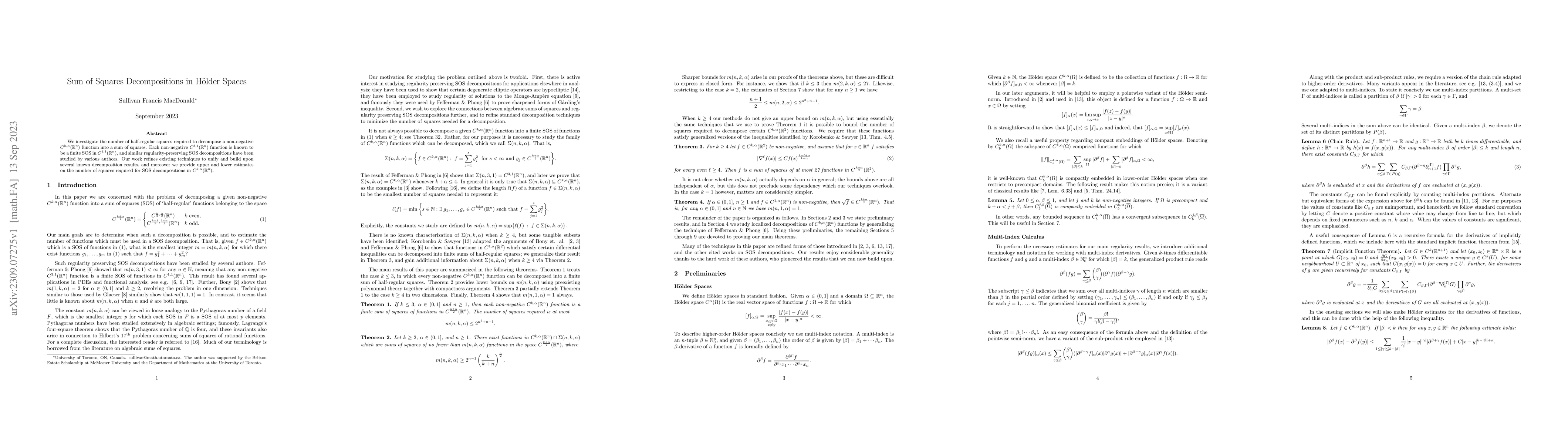 We investigate the number of half-regular squares required to decompose a non-negative $C^{k,\alpha}(\mathbb{R}^n)$ function into a sum of squares. Each non-negative $C^{3,1}(\mathbb{R}^n)$ function is known to be a finite SOS in $C^{1,1}(\mathbb{R}^n)$, and similar regularity-preserving SOS decompositions have been studied by various authors. Our work refines existing techniques to unify and build upon several known decomposition results, and moreover we provide upper and lower estimates on the number of squares required for SOS decompositions in $C^{k,\alpha}(\mathbb{R}^n)$.