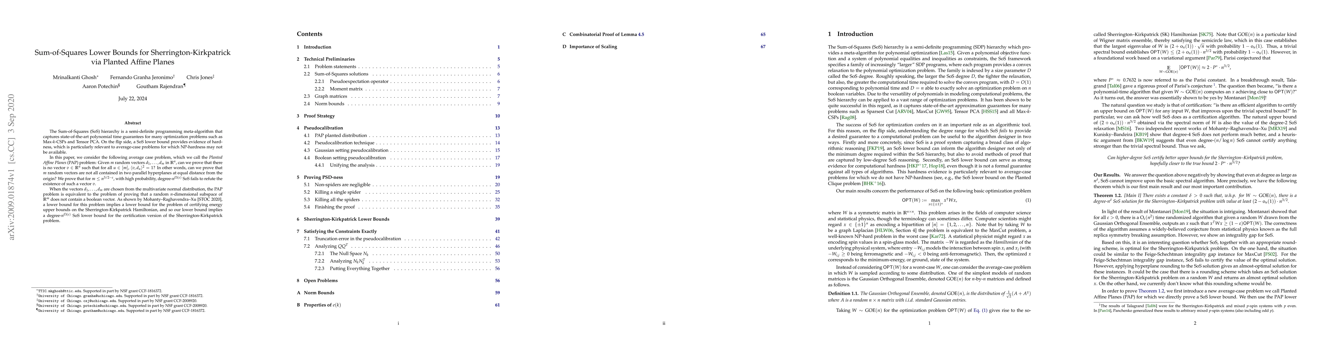 This paper establishes a Sum-of-Squares (SoS) lower bound for certifying solutions to the Planted Affine Planes (PAP) problem, which implies a similar lower bound for certifying energy bounds in the Sherrington-Kirkpatrick Hamiltonian model. For $m \leq n^{3/2-\epsilon}$, degree-$n^{\Omega(\epsilon)}$ SoS fails to refute the existence of a vector $v$ satisfying certain affine plane conditions.