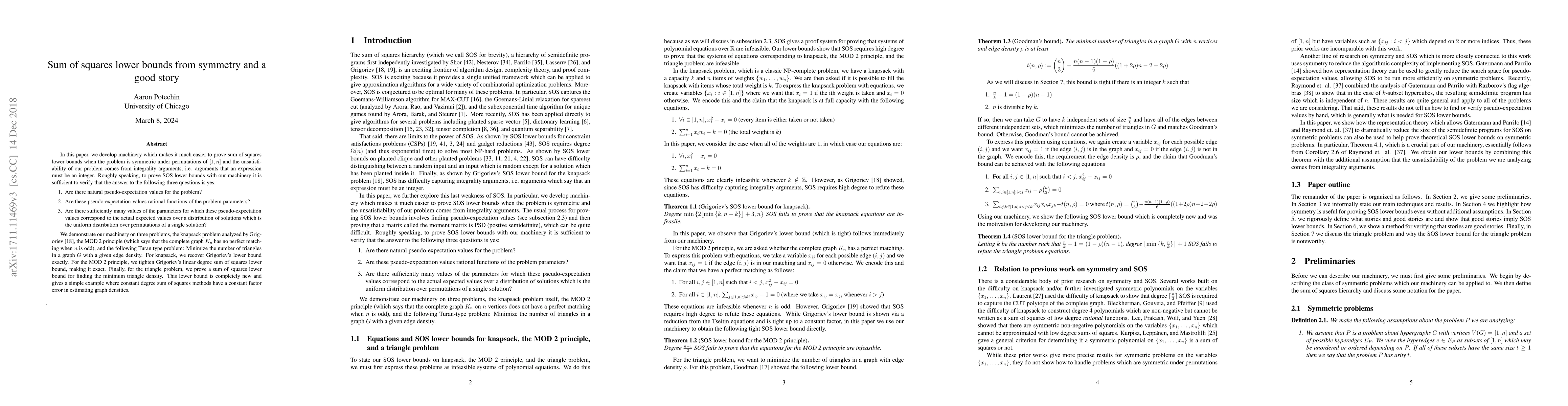 In this paper, we develop machinery which makes it much easier to prove sum of squares lower bounds when the problem is symmetric under permutations of $[1,n]$ and the unsatisfiability of our problem comes from integrality arguments, i.e. arguments that an expression must be an integer. Roughly speaking, to prove SOS lower bounds with our machinery it is sufficient to verify that the answer to the following three questions is yes: 1. Are there natural pseudo-expectation values for the problem? 2. Are these pseudo-expectation values rational functions of the problem parameters? 3. Are there sufficiently many values of the parameters for which these pseudo-expectation values correspond to the actual expected values over a distribution of solutions which is the uniform distribution over permutations of a single solution? We demonstrate our machinery on three problems, the knapsack problem analyzed by Grigoriev, the MOD 2 principle (which says that the complete graph $K_n$ has no perfect matching when $n$ is odd), and the following Turan type problem: Minimize the number of triangles in a graph $G$ with a given edge density. For knapsack, we recover Grigoriev's lower bound exactly. For the MOD 2 principle, we tighten Grigoriev's linear degree sum of squares lower bound, making it exact. Finally, for the triangle problem, we prove a sum of squares lower bound for finding the minimum triangle density. This lower bound is completely new and gives a simple example where constant degree sum of squares methods have a constant factor error in estimating graph densities.