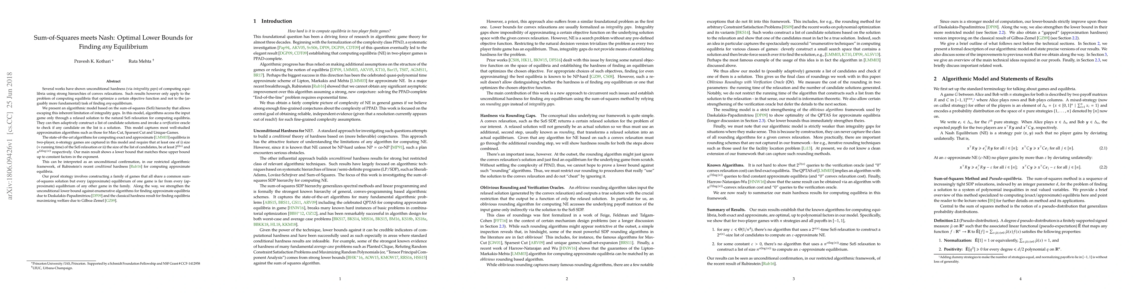 Several works have shown unconditional hardness (via integrality gaps) of computing equilibria using strong hierarchies of convex relaxations. Such results however only apply to the problem of computing equilibria that optimize a certain objective function and not to the (arguably more fundamental) task of finding \emph{any} equilibrium. We present an algorithmic model based on the sum-of-squares (SoS) hierarchy that allows escaping this inherent limitation of integrality gaps. In this model, algorithms access the input game only through a relaxed solution to the natural SoS relaxation for computing equilibria. They can then adaptively construct a list of candidate solutions and invoke a verification oracle to check if any candidate on the list is a solution. This model captures most well-studied approximation algorithms such as those for Max-Cut, Sparsest Cut, and Unique-Games. The state-of-the-art algorithms for computing exact and approximate equilibria in two-player, n-strategy games are captured in this model and require that at least one of i) size (~ running time) of the SoS relaxation or ii) the size of the list of candidates, be at least $2^{\Omega(n)}$ and $n^{\Omega(\log{(n)})}$ respectively. Our main result shows a lower bound that matches these upper bound up to constant factors in the exponent. This can be interpreted as an unconditional confirmation, in our restricted algorithmic framework, of Rubinstein's recent conditional hardness \cite{Rub} for computing approximate equilibria. Our proof strategy involves constructing a family of games that all share a common sum-of-squares solution but every (approximate) equilibrium of one game is far from every (approximate) equilibrium of any other game in the family.