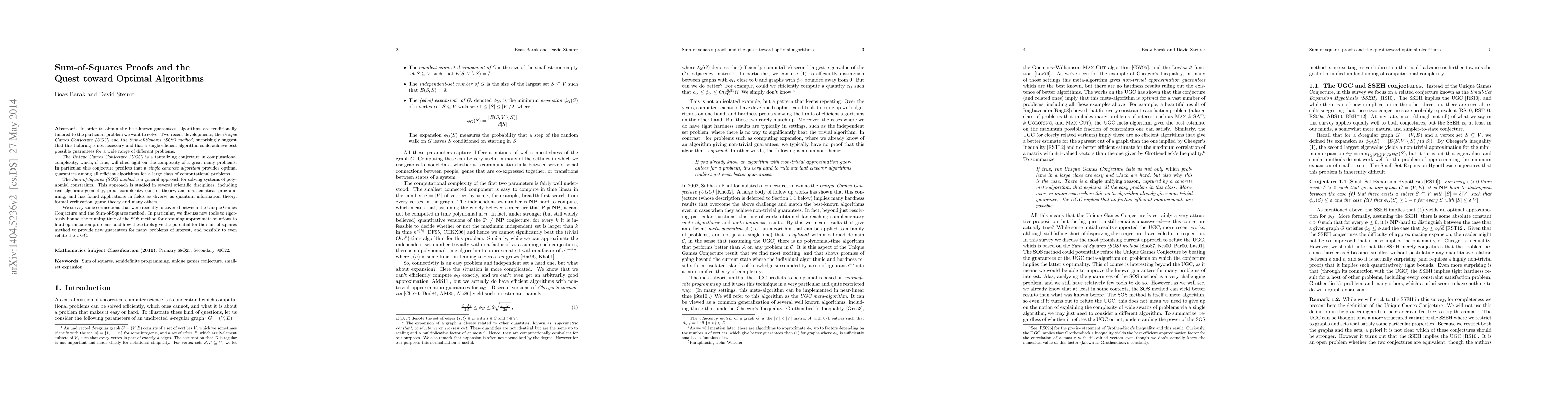 In order to obtain the best-known guarantees, algorithms are traditionally tailored to the particular problem we want to solve. Two recent developments, the Unique Games Conjecture (UGC) and the Sum-of-Squares (SOS) method, surprisingly suggest that this tailoring is not necessary and that a single efficient algorithm could achieve best possible guarantees for a wide range of different problems. The Unique Games Conjecture (UGC) is a tantalizing conjecture in computational complexity, which, if true, will shed light on the complexity of a great many problems. In particular this conjecture predicts that a single concrete algorithm provides optimal guarantees among all efficient algorithms for a large class of computational problems. The Sum-of-Squares (SOS) method is a general approach for solving systems of polynomial constraints. This approach is studied in several scientific disciplines, including real algebraic geometry, proof complexity, control theory, and mathematical programming, and has found applications in fields as diverse as quantum information theory, formal verification, game theory and many others. We survey some connections that were recently uncovered between the Unique Games Conjecture and the Sum-of-Squares method. In particular, we discuss new tools to rigorously bound the running time of the SOS method for obtaining approximate solutions to hard optimization problems, and how these tools give the potential for the sum-of-squares method to provide new guarantees for many problems of interest, and possibly to even refute the UGC.