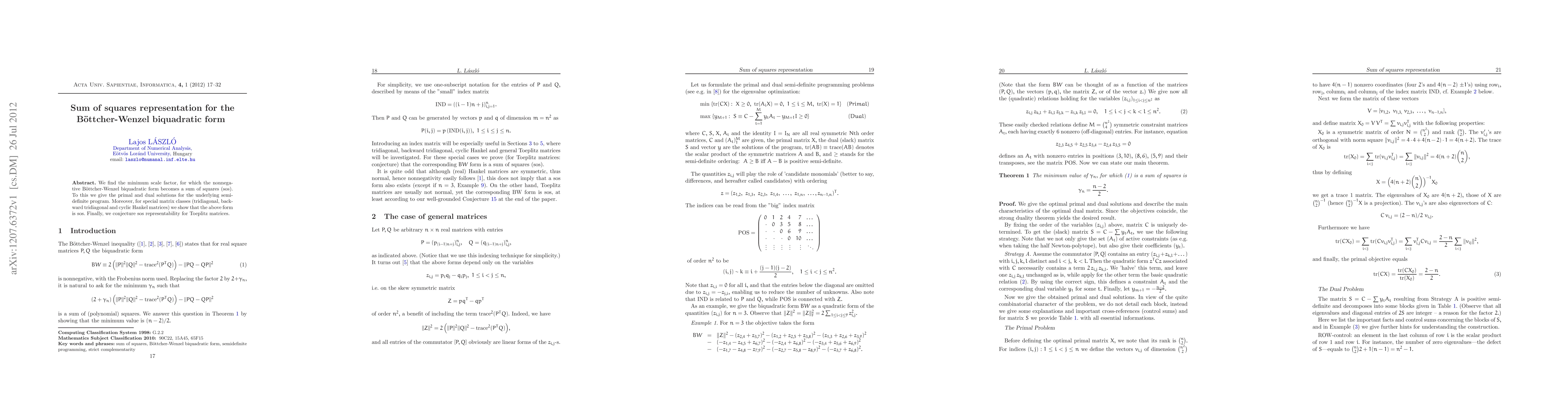 We find the minimum scale factor, for which the nonnegative B\"ottcher-Wenzel biquadratic form becomes a sum of squares (sos). To this we give the primal and dual solutions for the underlying semide finite program. Moreover, for special matrix classes (tridiagonal, backward tridiagonal and cyclic Hankel matrices) we show that the above form is sos. Finally, we conjecture sos representability for Toeplitz matrices.