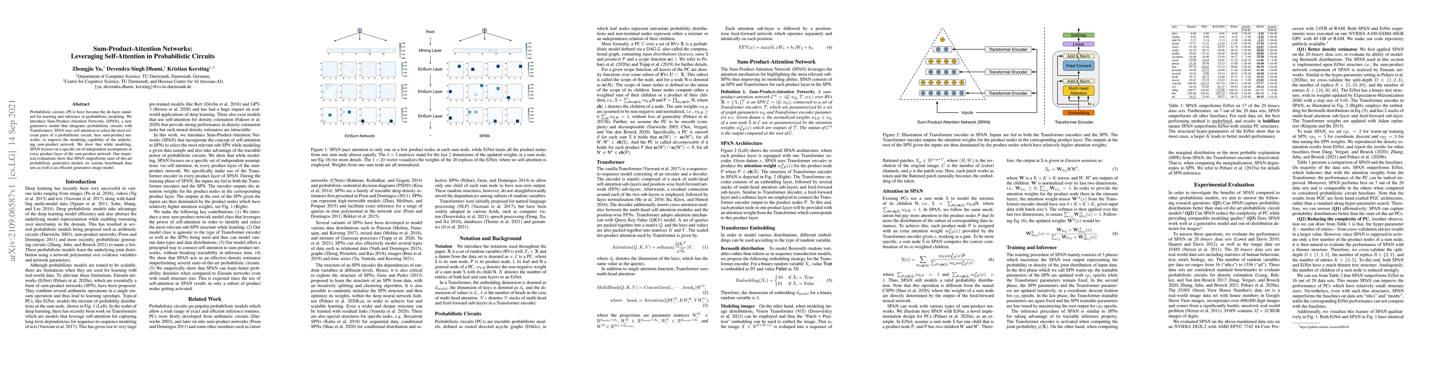 Summary: Sum-Product-Attention Networks (SPAN) combine probabilistic circuits with Transformers to enhance sum-product networks' modeling capabilities using self-attention. Empirical evaluations show SPAN outperforms existing probabilistic generative models on various benchmarks and is efficient for image generation.