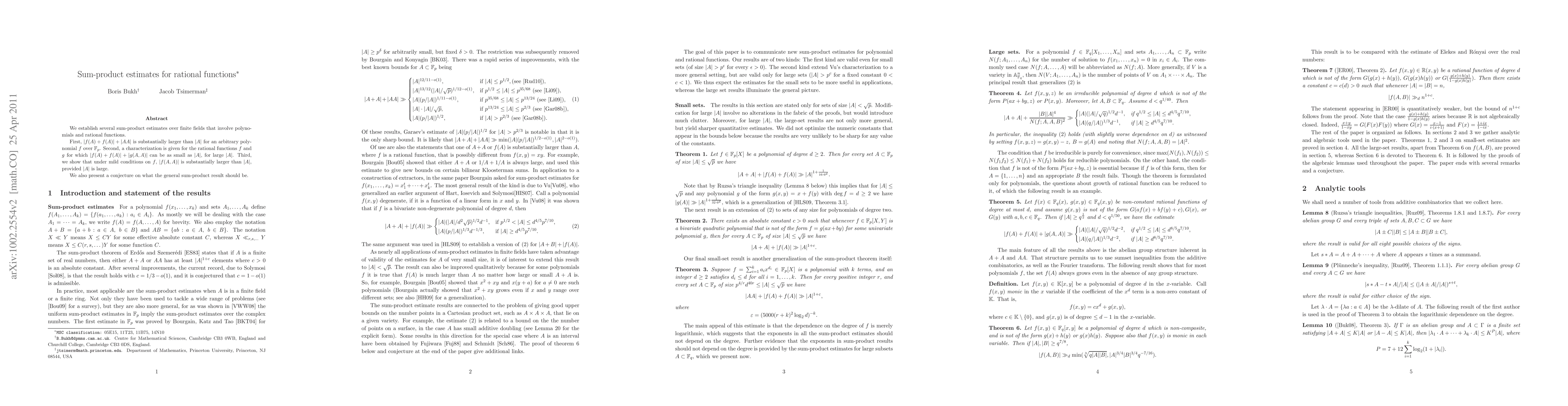 We establish several sum-product estimates over finite fields that involve polynomials and rational functions. First, |f(A)+f(A)|+|AA| is substantially larger than |A| for an arbitrary polynomial f over F_p. Second, a characterization is given for the rational functions f and g for which |f(A)+f(A)|+|g(A,A)| can be as small as |A|, for large |A|. Third, we show that under mild conditions on f, |f(A,A)| is substantially larger than |A|, provided |A| is large. We also present a conjecture on what the general sum-product result should be.