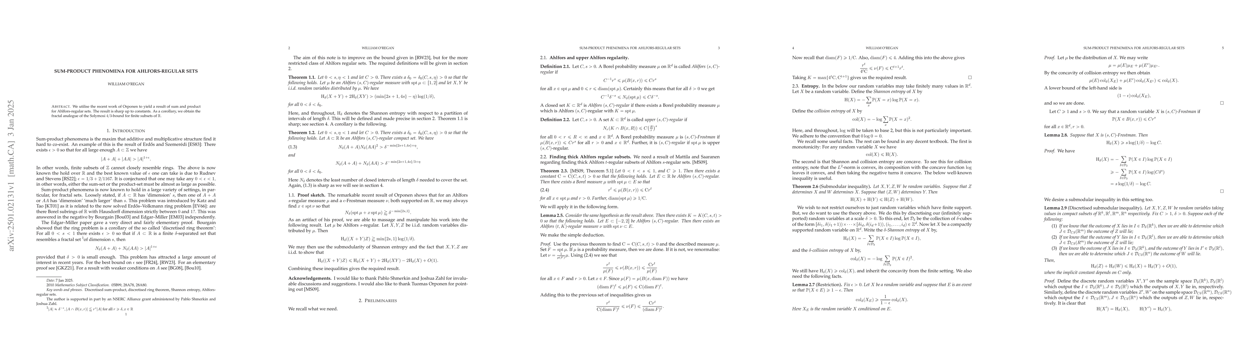 This paper leverages Orponen's work to establish a sum-product result for Ahlfors-regular sets, achieving sharpness up to constants. Consequently, it delivers a fractal version of the Solymosi $4/3$-bound for finite subsets in $\mathbb{R}$.