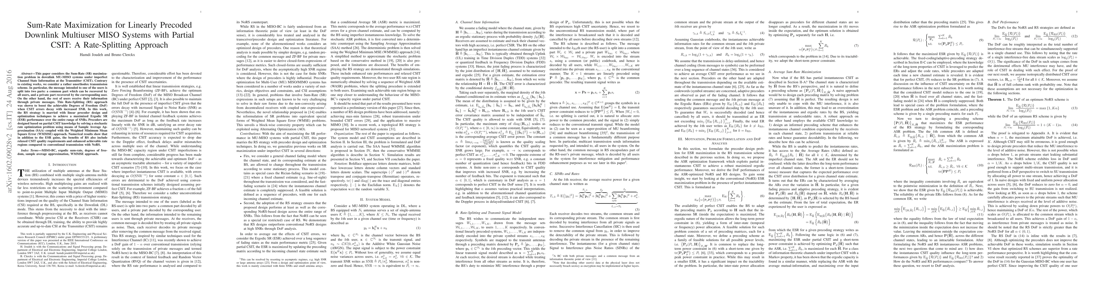 This paper explores the Sum-Rate maximization in downlink MU-MISO systems using a Rate-Splitting approach with linear precoding under partial CSIT. The proposed method splits messages into common and private parts, enhancing achievable Degrees of Freedom and Ergodic Sum-Rate performance across various SNR levels.