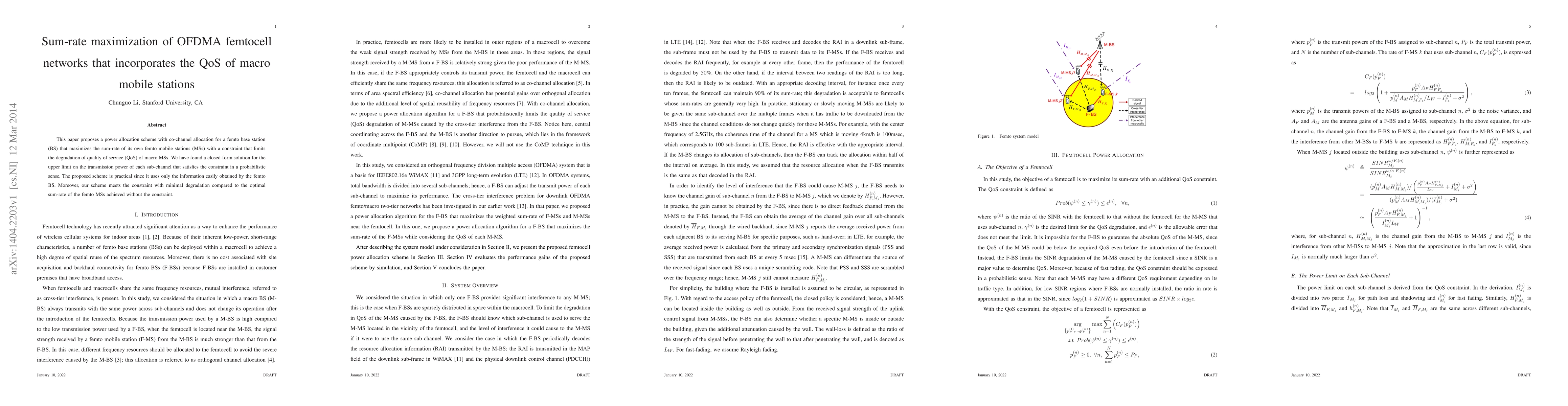 This paper proposes a power allocation scheme for femto base stations to maximize sum-rate of its own mobile stations while minimizing degradation of macro mobile stations' QoS.