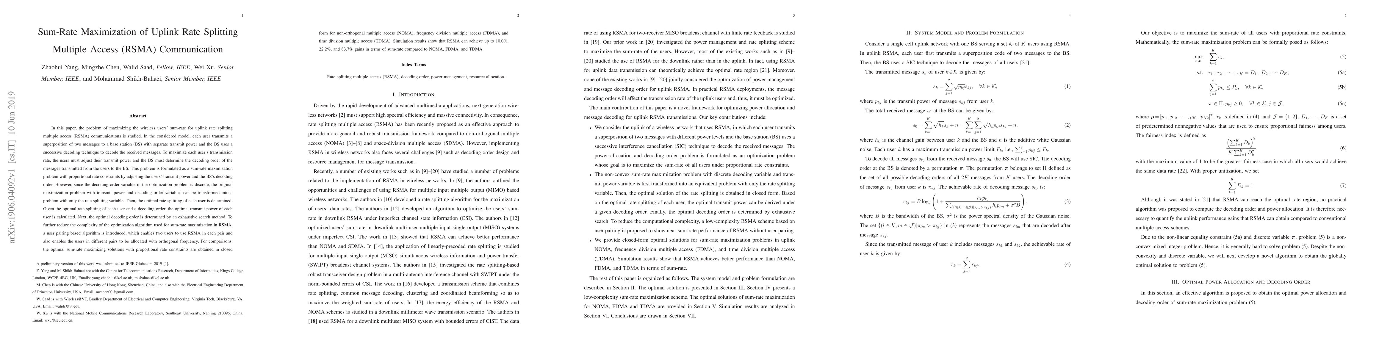 In this paper, the problem of maximizing the wireless users' sum-rate for uplink rate splitting multiple access (RSMA) communications is studied. In the considered model, each user transmits a superposition of two messages to a base station (BS) with separate transmit power and the BS uses a successive decoding technique to decode the received messages. To maximize each user's transmission rate, the users must adjust their transmit power and the BS must determine the decoding order of the messages transmitted from the users to the BS. This problem is formulated as a sum-rate maximization problem with proportional rate constraints by adjusting the users' transmit power and the BS's decoding order. However, since the decoding order variable in the optimization problem is discrete, the original maximization problem with transmit power and decoding order variables can be transformed into a problem with only the rate splitting variable. Then, the optimal rate splitting of each user is determined. Given the optimal rate splitting of each user and a decoding order, the optimal transmit power of each user is calculated. Next, the optimal decoding order is determined by an exhaustive search method. To further reduce the complexity of the optimization algorithm used for sum-rate maximization in RSMA, a user pairing based algorithm is introduced, which enables two users to use RSMA in each pair and also enables the users in different pairs to be allocated with orthogonal frequency. For comparisons, the optimal sum-rate maximizing solutions with proportional rate constraints are obtained in closed form for non-orthogonal multiple access (NOMA), frequency division multiple access (FDMA), and time division multiple access (TDMA). Simulation results show that RSMA can achieve up to 10.0\%, 22.2\%, and 83.7\% gains in terms of sum-rate compared to NOMA, FDMA, and TDMA.