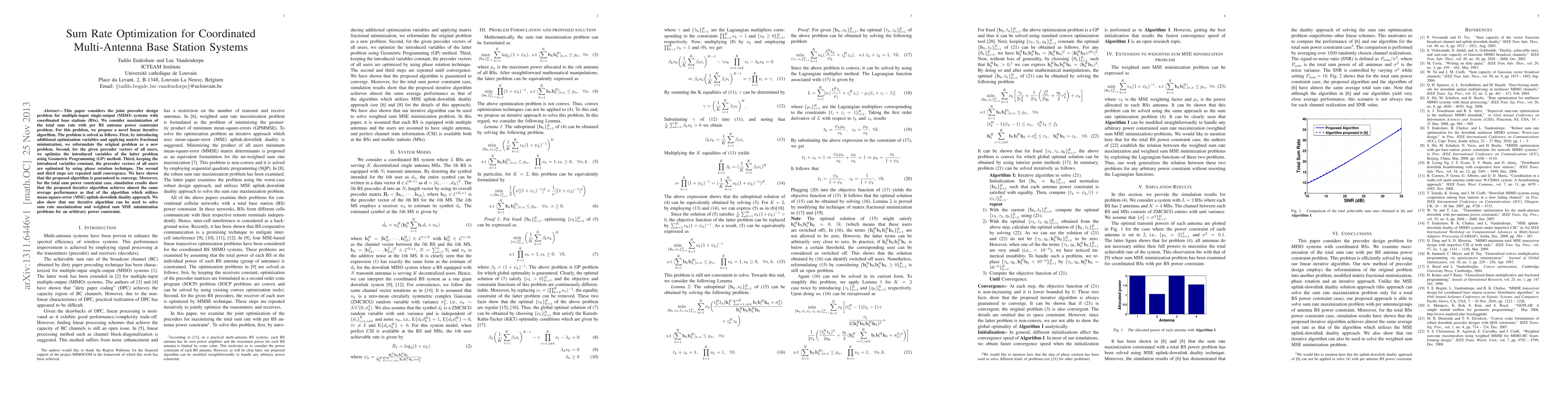 This paper proposes a novel linear iterative algorithm for optimizing the sum rate in coordinated multi-antenna base station systems, reformulating the problem using matrix fractional minimization and solving it via Geometric Programming and phase rotation techniques. The algorithm achieves near-optimal performance and is shown to converge.