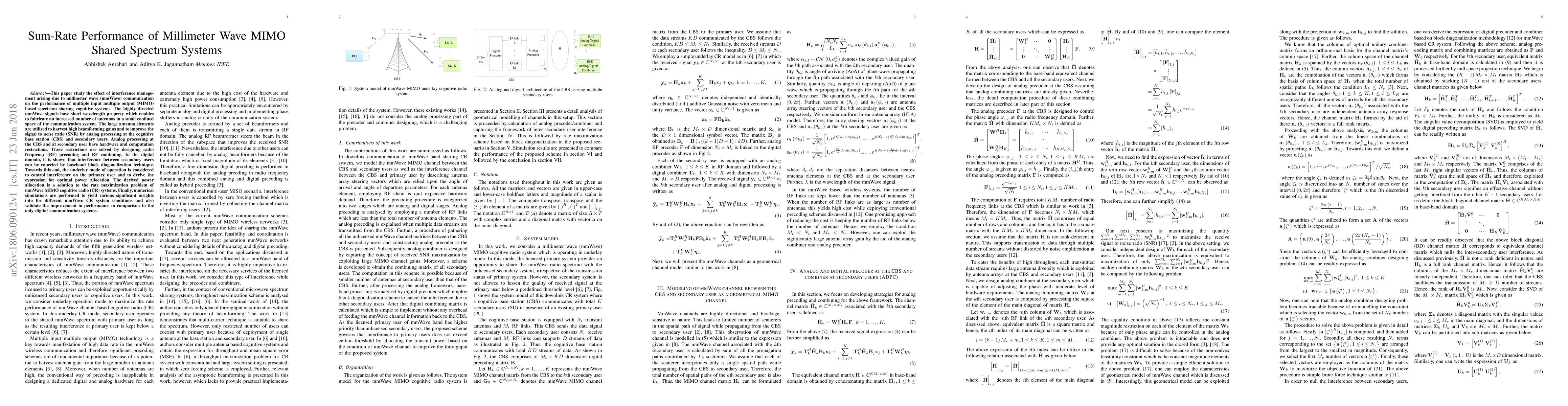 This paper study the effect of interference management arising due to millimeter wave (mmWave) communication on the performance of multiple input multiple output (MIMO) based spectrum sharing cognitive systems. The highly directed mmWave signals have short wavelength property which enables to fabricate an increased number of antennas in a small confined space of the communication system. The large antenna elements are utilized to harvest high beamforming gains and to improve the signal to noise ratio (SNR) by analog processing at the cognitive base station (CBS) and secondary users. Analog processing at the CBS and at secondary user have hardware and computation restrictions. These restrictions are solved by designing radio frequency (RF) precoding and RF combining. In the digital domain, it is shown that interference between secondary users can be canceled by baseband block diagonalization technique. Towards this end, the underlay mode of operation is considered to control interference on the primary user and to derive the expression for optimal power allocation. The derived power allocation is a solution to the rate maximization problem of mmWave MIMO cognitive radio (CR) systems. Finally, numerical simulations are performed to yield various significant insights into for different mmWave CR system conditions and also validate the improvement in performance in comparison to the only digital communication systems.