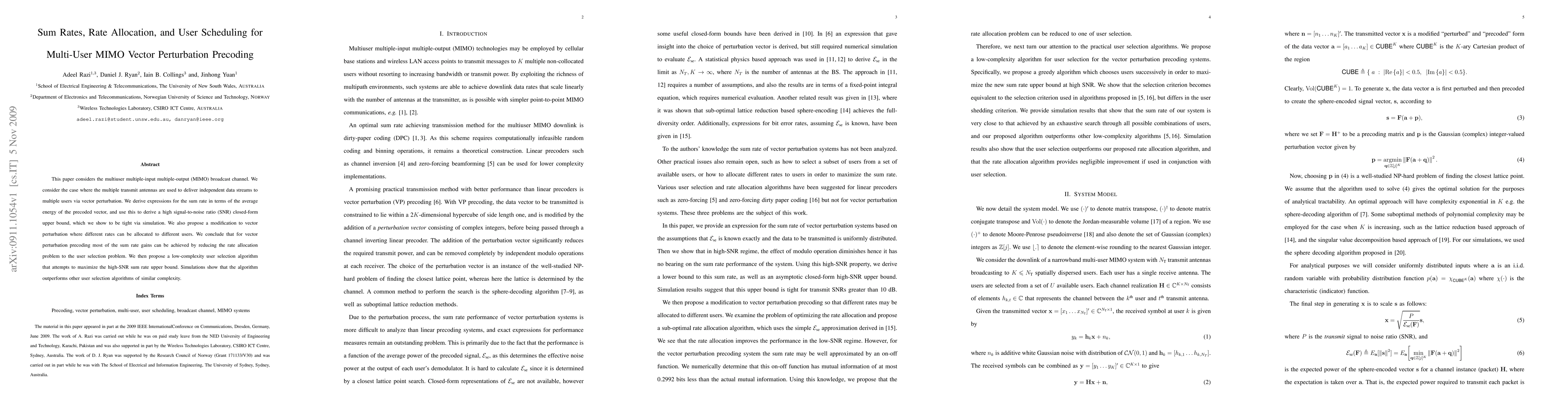 This paper considers the multiuser multiple-input multiple-output (MIMO) broadcast channel. We consider the case where the multiple transmit antennas are used to deliver independent data streams to multiple users via vector perturbation. We derive expressions for the sum rate in terms of the average energy of the precoded vector, and use this to derive a high signal-to-noise ratio (SNR) closed-form upper bound, which we show to be tight via simulation. We also propose a modification to vector perturbation where different rates can be allocated to different users. We conclude that for vector perturbation precoding most of the sum rate gains can be achieved by reducing the rate allocation problem to the user selection problem. We then propose a low-complexity user selection algorithm that attempts to maximize the high-SNR sum rate upper bound. Simulations show that the algorithm outperforms other user selection algorithms of similar complexity.