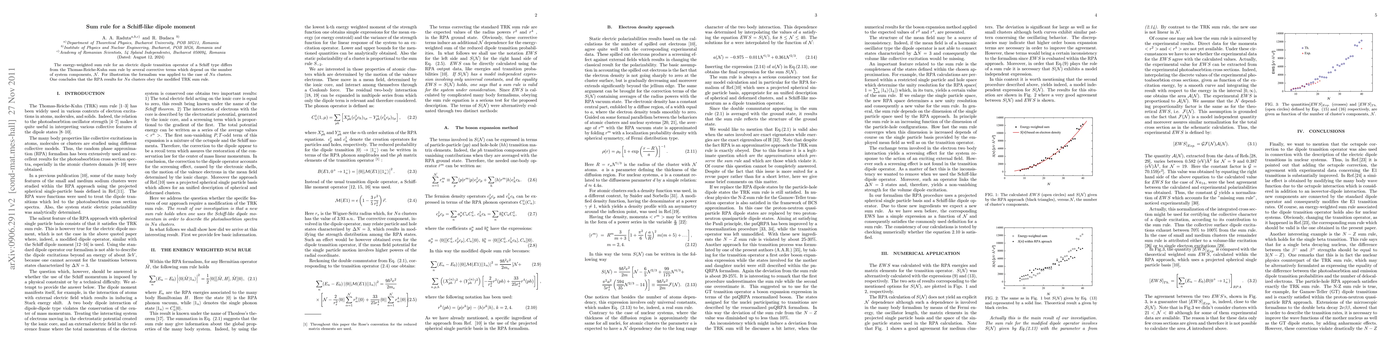 This paper evaluates the energy-weighted sum rule for a Schiff-type dipole moment, showing deviations from the Thomas-Reiche-Kuhn sum rule with corrective terms dependent on the number of components, ${\cal N}$. Two approaches, one analytical and one based on the RPA, provide expressions for these corrections, which are illustrated using $Na$ clusters.
