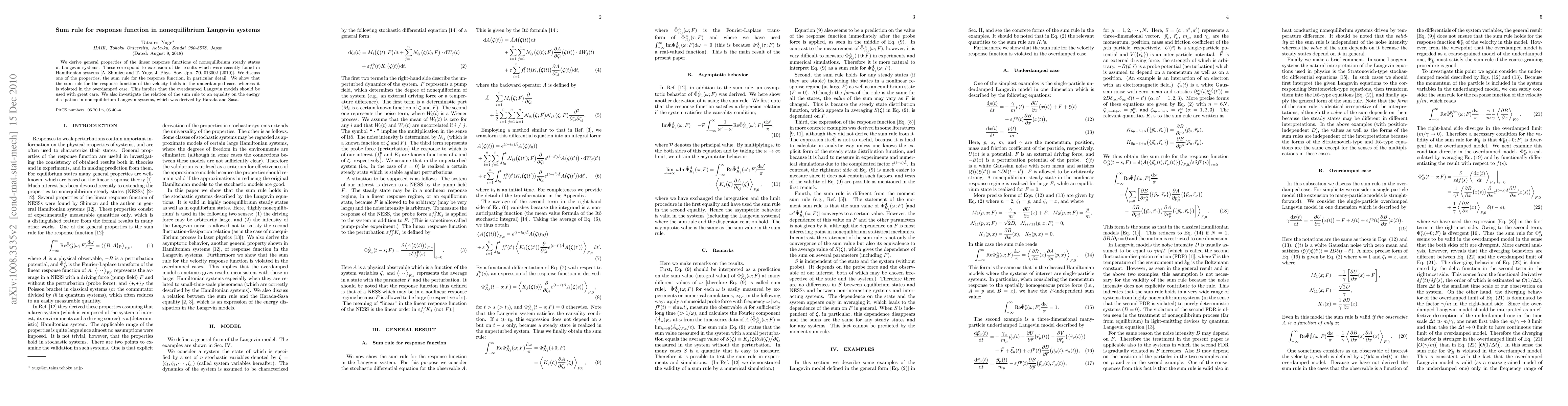 This paper derives properties of linear response functions in nonequilibrium steady states of Langevin systems, extending previous results from Hamiltonian systems. It focuses on the sum rule for response functions, showing its validity in underdamped systems but violation in overdamped systems, highlighting the need for careful use of overdamped models.