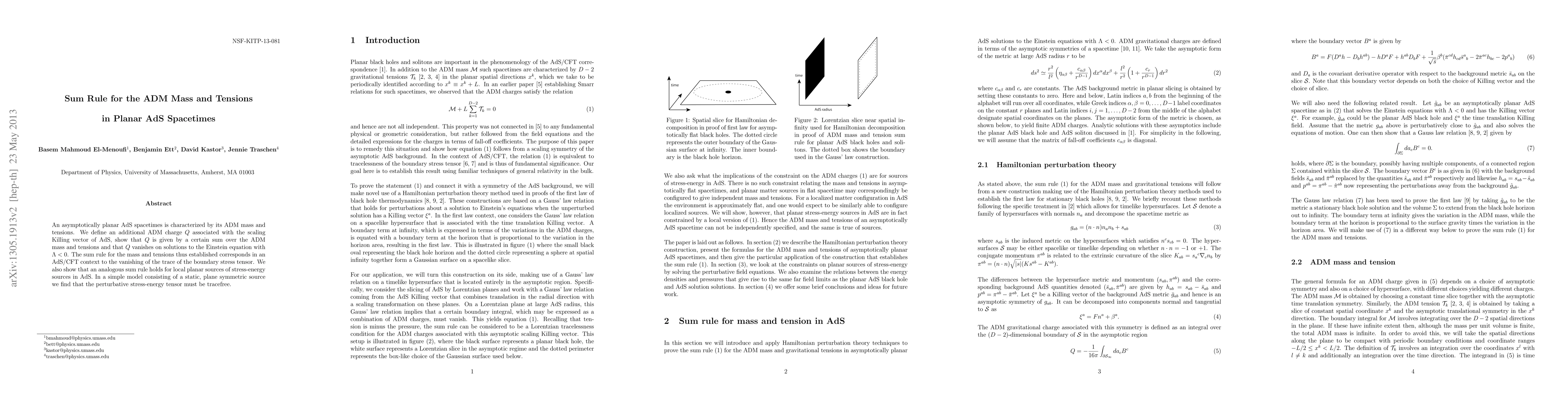 An asymptotically planar AdS spacetimes is characterized by its ADM mass and tensions. We define an additional ADM charge Q associated with the scaling Killing vector of AdS, show that Q is given by a certain sum over the ADM mass and tensions and that Q vanishes on solutions to the Einstein equation with negative cosmological constant. The sum rule for the mass and tensions thus established corresponds in an AdS/CFT context to the vanishing of the trace of the boundary stress tensor. We also show that an analogous sum rule holds for local planar sources of stress-energy sources in AdS. In a simple model consisting of a static, plane symmetric source we find that the perturbative stress-energy tensor must be tracefree.