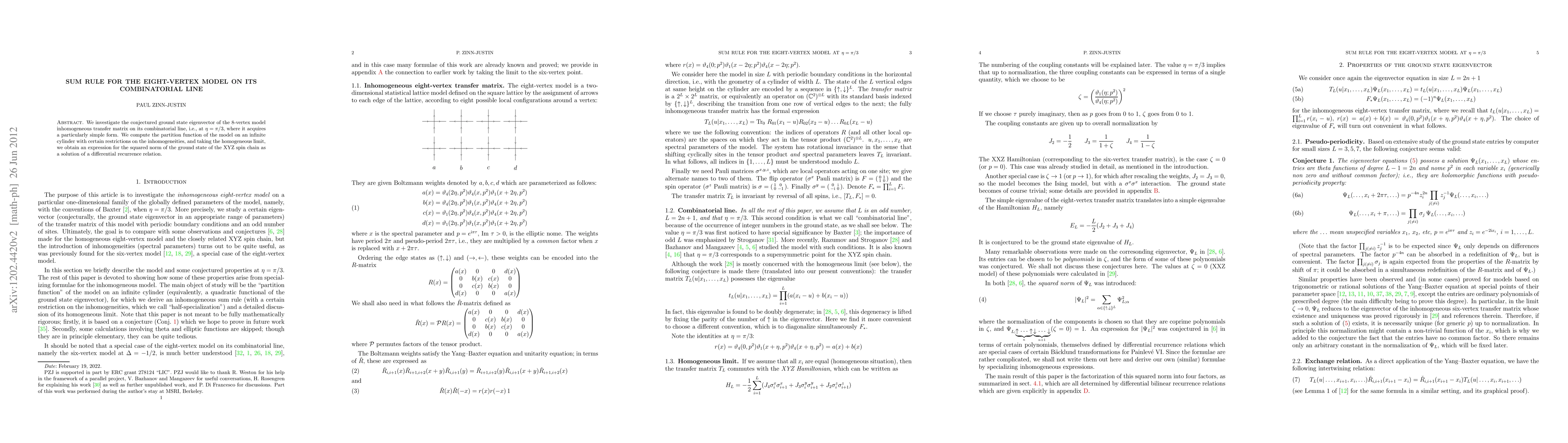 We investigate the conjectured ground state eigenvector of the 8-vertex model inhomogeneous transfer matrix on its combinatorial line, i.e., at $\eta=\pi/3$, where it acquires a particularly simple form. We compute the partition function of the model on an infinite cylinder with certain restrictions on the inhomogeneities, and taking the homogeneous limit, we obtain an expression for the squared norm of the ground state of the XYZ spin chain as a solution of a differential recurrence relation.