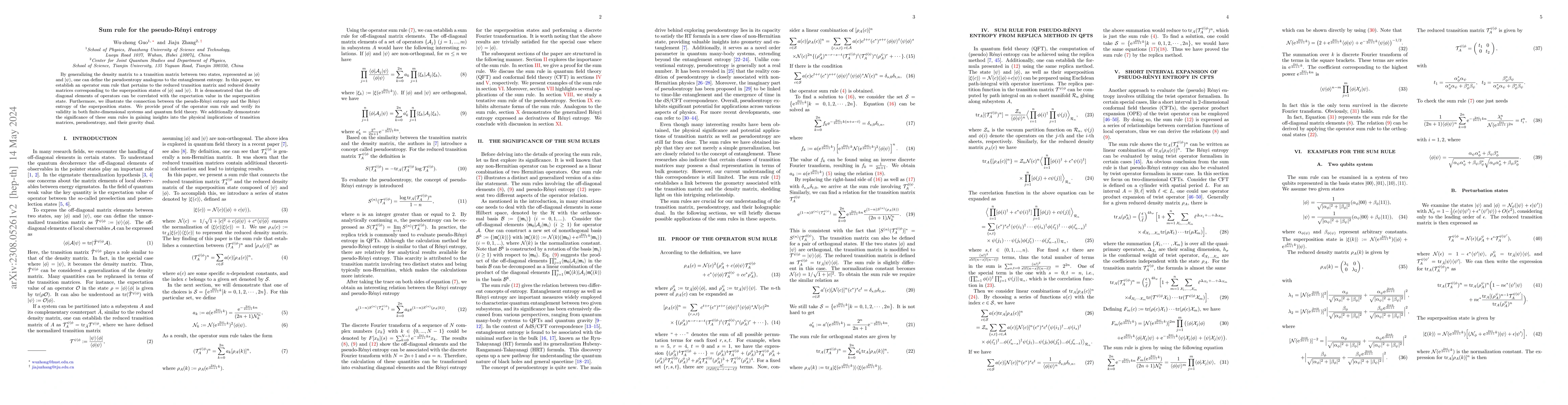 The paper establishes an operator sum rule for pseudo-Rényi entropy derived from transition matrices between states $|\phi\rangle$ and $|\psi\rangle$, correlating off-diagonal elements with superposition state expectations, and verifies its applicability in both finite-dimensional systems and quantum field theory.