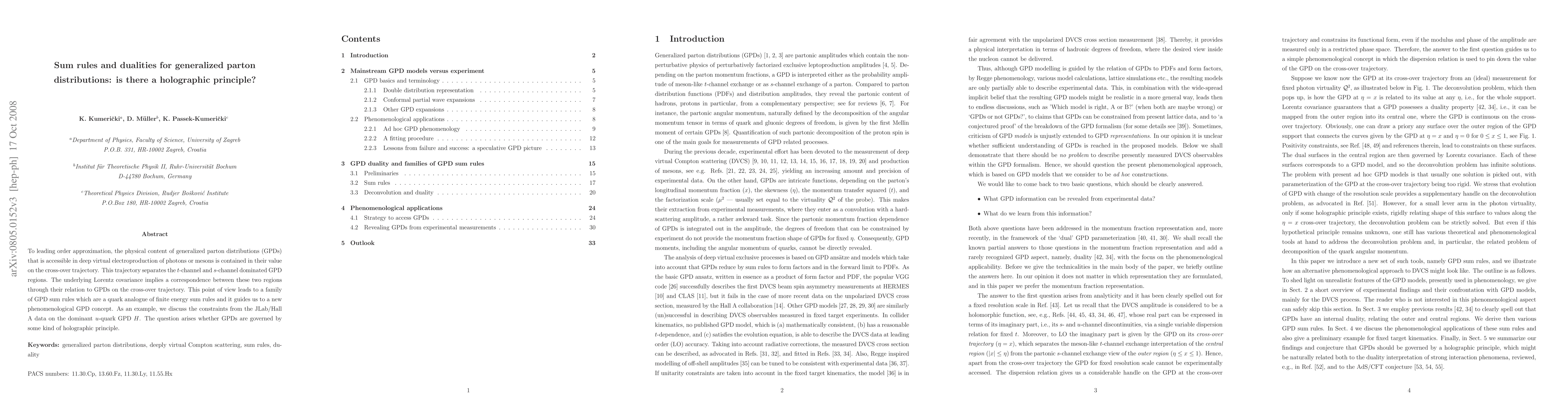 To leading order approximation, the physical content of generalized parton distributions (GPDs) that is accessible in deep virtual electroproduction of photons or mesons is contained in their value on the cross-over trajectory. This trajectory separates the t-channel and s-channel dominated GPD regions. The underlying Lorentz covariance implies correspondence between these two regions through their relation to GPDs on the cross-over trajectory. This point of view leads to a family of GPD sum rules which are a quark analogue of finite energy sum rules and it guides us to a new phenomenological GPD concept. As an example, we discuss the constraints from the JLab/Hall A data on the dominant u-quark GPD H. The question arises whether GPDs are governed by some kind of holographic principle.