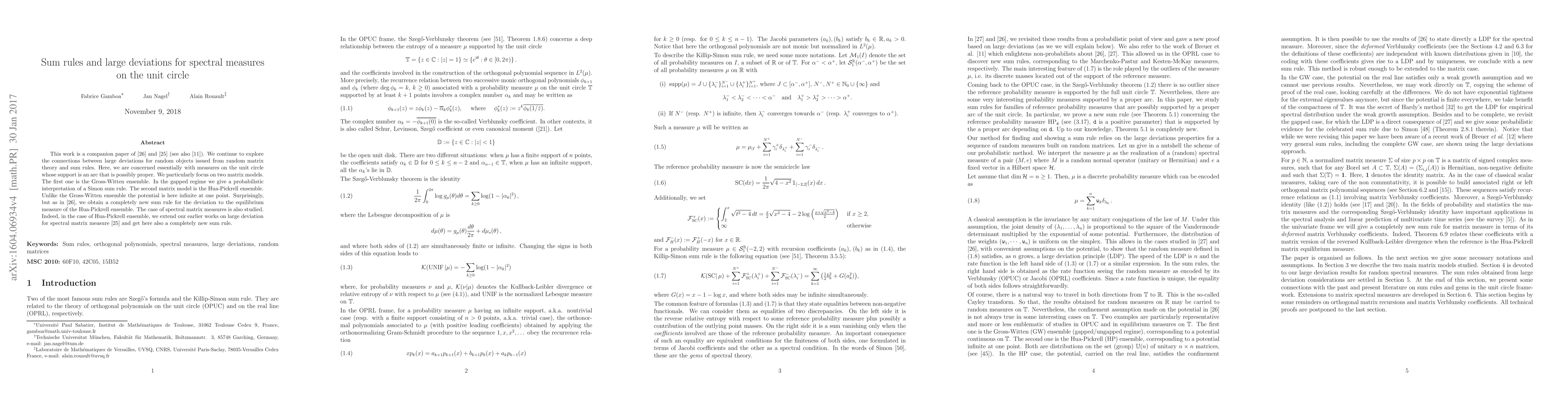 Researchers explore connections between large deviations for random objects on the unit circle and sum rules, discovering new sum rules for two specific matrix models.
