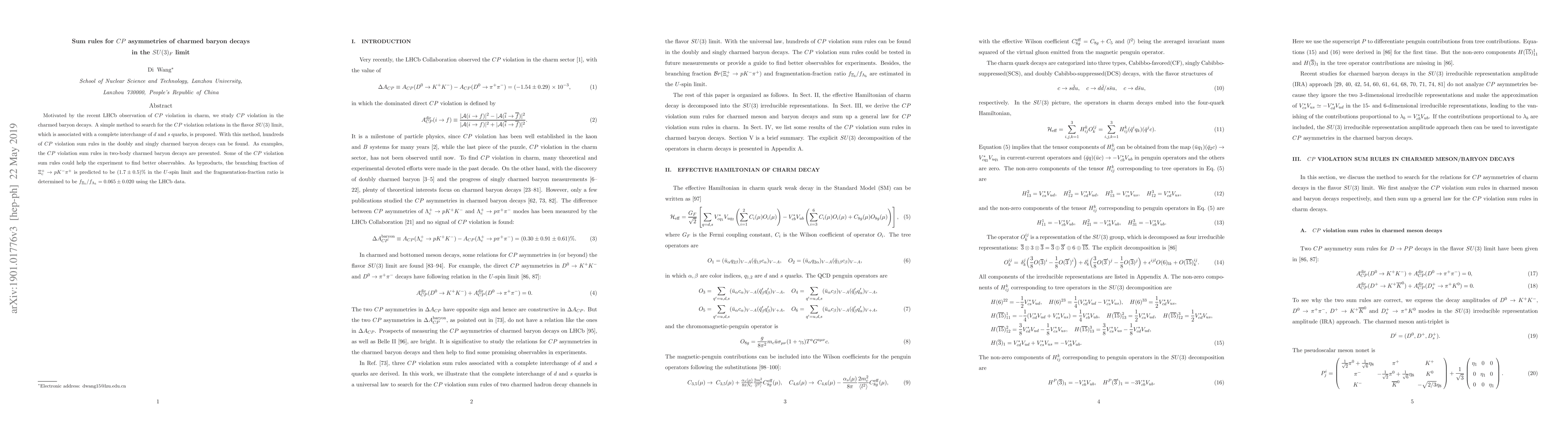This paper proposes a method to derive CP violation sum rules for charmed baryon decays under the SU(3) flavor symmetry limit, providing hundreds of relations that could enhance experimental detection of CP violation. Additionally, it predicts the branching fraction for $\Xi^+_c\to pK^-\pi^+$ and determines the fragmentation-fraction ratio $f_{\Xi_b}/f_{\Lambda_b}$ using LHCb data.