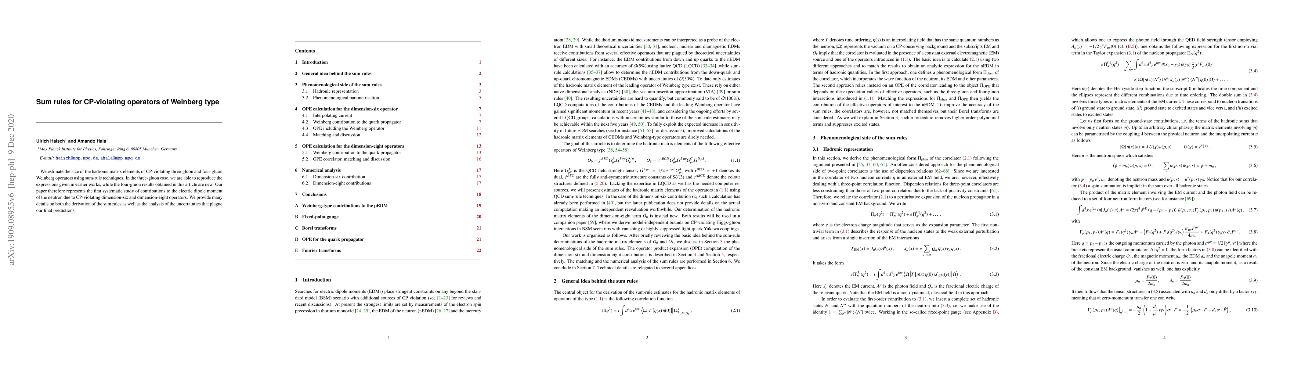 This paper estimates the hadronic matrix elements of CP-violating three-gluon and four-gluon Weinberg operators using sum-rule techniques, providing new results for the four-gluon case and reproducing earlier findings for the three-gluon case. It represents the first systematic study of contributions to the neutron's electric dipole moment from CP-violating dimension-six and dimension-eight operators.