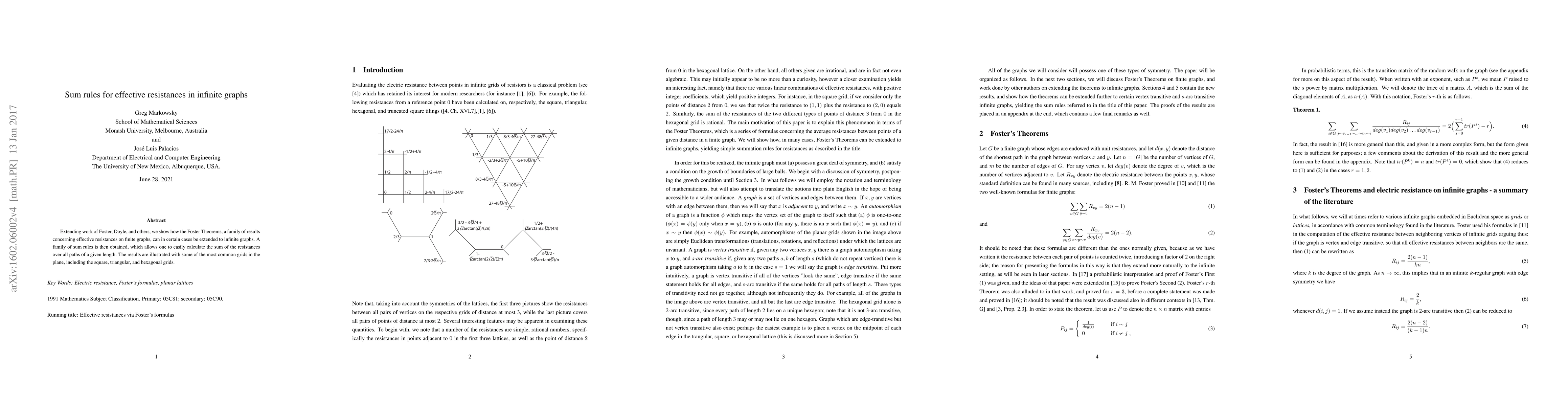 Extending work of Foster, Doyle, and others, we show how the Foster Theorems, a family of results concerning effective resistances on finite graphs, can in certain cases be extended to infinite graphs. A family of sum rules is then obtained, which allows one to easily calculate the sum of the resistances over all paths of a given length. The results are illustrated with some of the most common grids in the plane, including the square, triangular, and hexagonal grids.