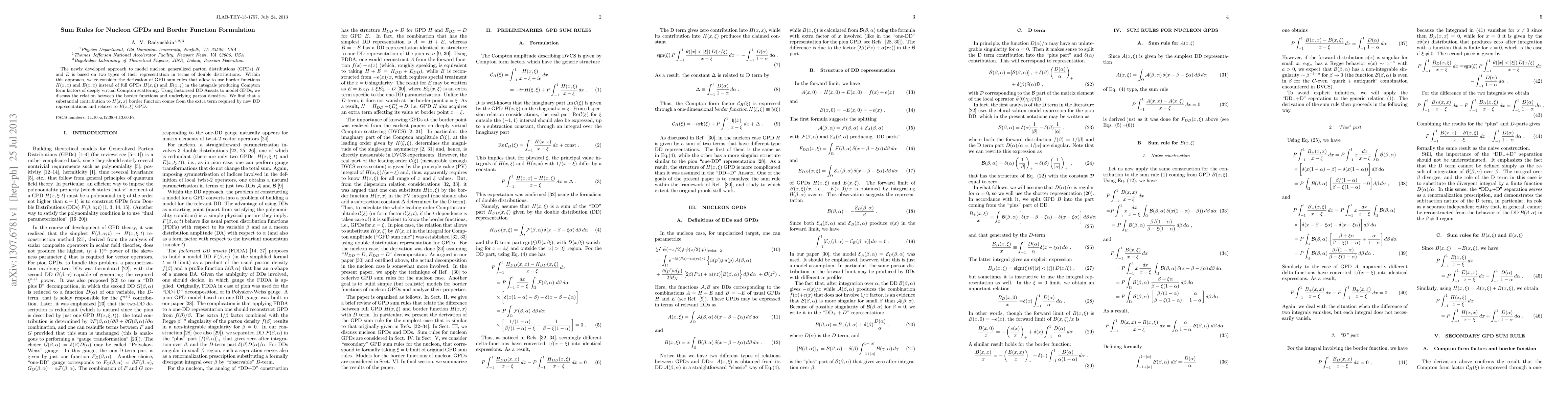 This research introduces a novel method to model nucleon generalized parton distributions (GPDs) using double distributions, leading to sum rules that utilize border functions H(x,x) and E(x,x) instead of full GPDs. The study finds that a significant part of the H(x,x) border function originates from an extra term related to E(x,ξ) GPD, offering insights into the relationship between border functions and underlying parton densities.