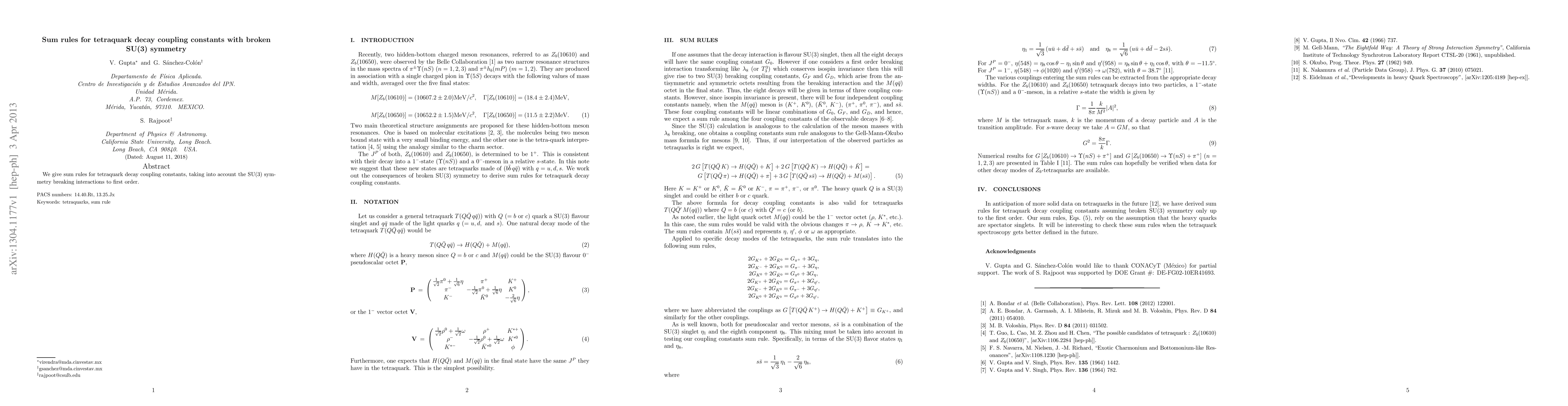 We give sum rules for tetraquark decay coupling constants, taking into account the SU(3) symmetry breaking interactions to first order.
