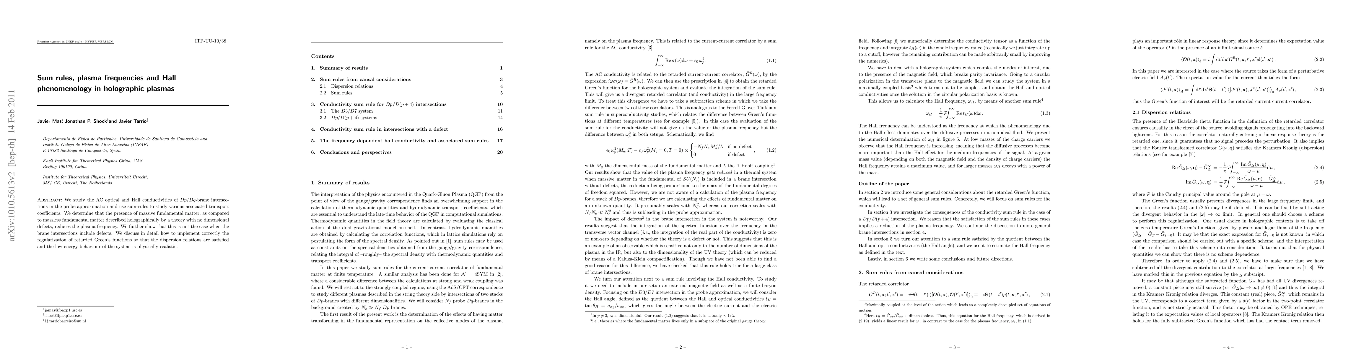 We study the AC optical and hall conductivities of Dp/Dq-branes intersections in the probe approximation and use sum-rules to study various associated transport coefficients. We determine that the presence of massive fundamental matter, as compared to massless fundamental matter described holographically by a theory with no dimensional defects, reduces the plasma frequency. We further show that this is not the case when the brane intersections include defects. We discuss in detail how to implement correctly the regularization of retarded Green's functions so that the dispersion relations are satisfied and the low energy behaviour of the system is physically realistic.