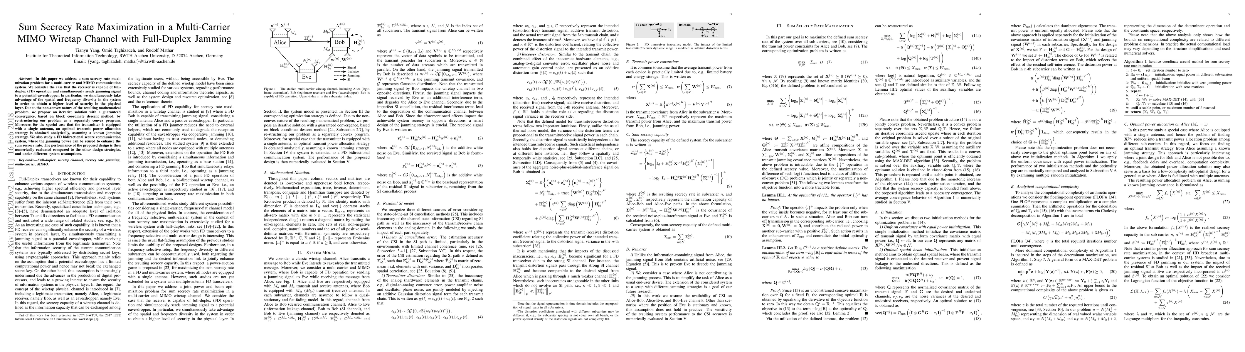 The paper presents an iterative solution with guaranteed convergence for sum secrecy rate maximization in a multi-carrier MIMO wiretap channel using full-duplex jamming, along with an optimal power allocation strategy for single-antenna transmitter.