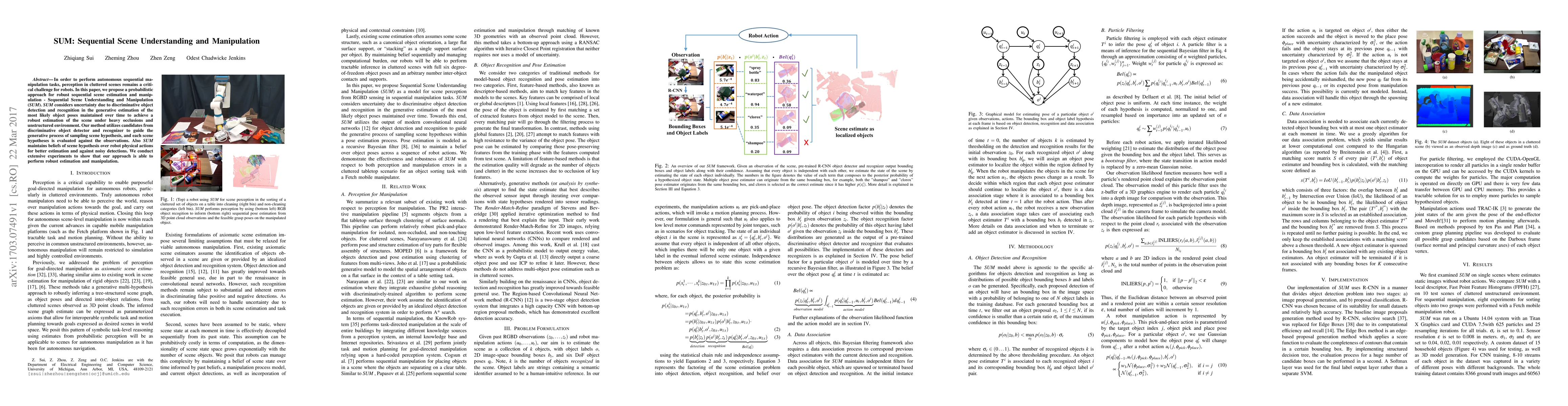 This paper proposes SUM, a probabilistic method for robust sequential scene estimation and manipulation in cluttered environments. SUM addresses uncertainty in object detection and recognition to generate and maintain likely object poses over time, enabling effective scene estimation and manipulation despite occlusions and unstructured settings.