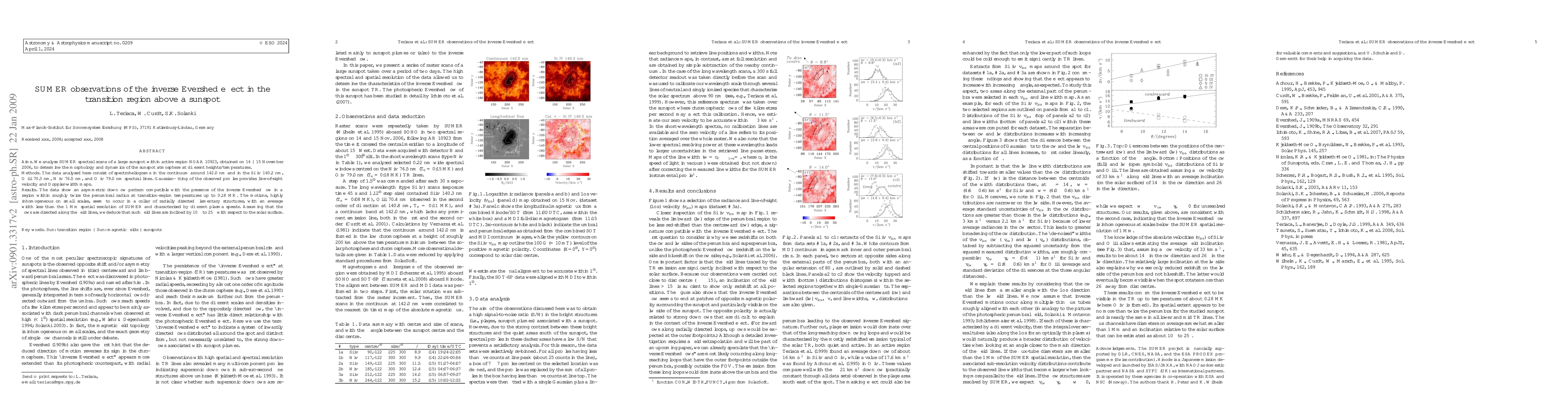 Aims. We analyse SUMER spectral scans of a large sunspot within active region NOAA 10923, obtained on 14-15 November 2006, to determine the morphology and dynamics of the sunspot atmosphere at different heights/temperatures. Methods: The data analysed here consist of spectroheliograms in the continuum around 142.0 nm and in the Si iv 140.2 nm, O iii 70.3 nm, N iv 76.5 nm, and O iv 79.0 nm spectral lines. Gaussian-fitting of the observed profiles provides line-of-sight velocity and Doppler-width maps. Results: The data show an asymmetric downflow pattern compatible with the presence of the inverse Evershed flow in a region within roughly twice the penumbral radius at transition-region temperatures up to 0.18 MK. The motions, highly inhomogeneous on small scales, seem to occur in a collar of radially directed filamentary structures, with an average width less than the 1 Mm spatial resolution of SUMER and characterised by different plasma speeds. Assuming that the flows are directed along the field lines, we deduce that such field lines are inclined by 10 deg to 25 deg with respect to the solar surface.